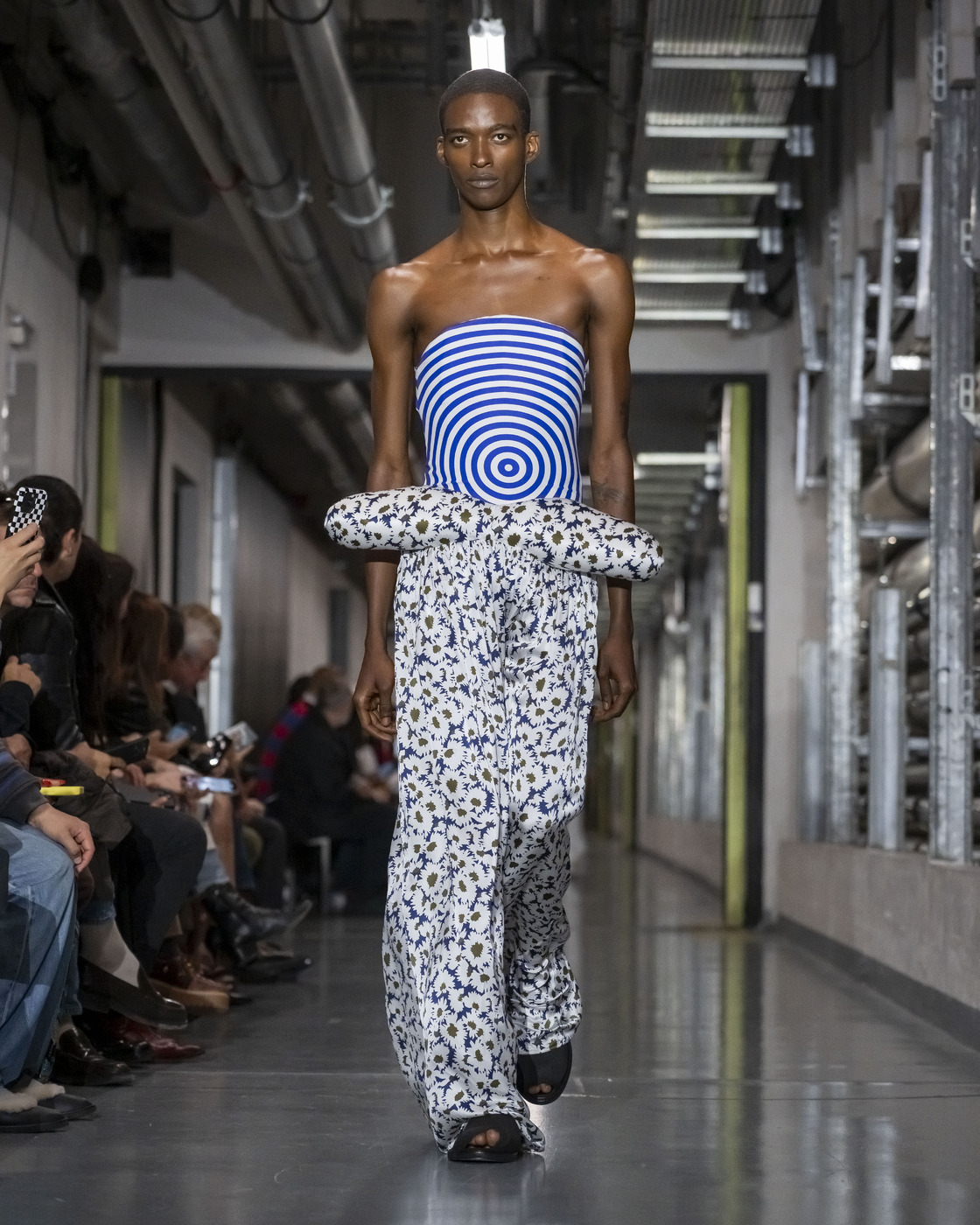 랜팅크는 클럽에 춤추러 갈 때 입을 법한 옷을 선보이며 젊은 고객의 마음을 사로잡았다. 허리 라인부터 발목까지 팽팽하게 당겨지는 두 줄의 천만으로 구성된 팬츠는 땀 냄새로 가득한 레이브 파티에 적합해 보였다. 하우스의 아이콘 같은 콘 브라, 마린 스트라이프, ‘고티에 주니어’ 로고의 파격적인 재해석은 프런트 로에 앉아 있던 창립자를 흐뭇하게 했다. “본능에 따라 디자인합니다. 늘 어떤 에너지를 포착하려 노력하죠.” 만약 ‘어르신들’이 그 에너지를 불편한 시선으로 바라본다면? 랜팅크는 의도가 적중했다는 듯 살짝 미소를 띨 것이다. VK