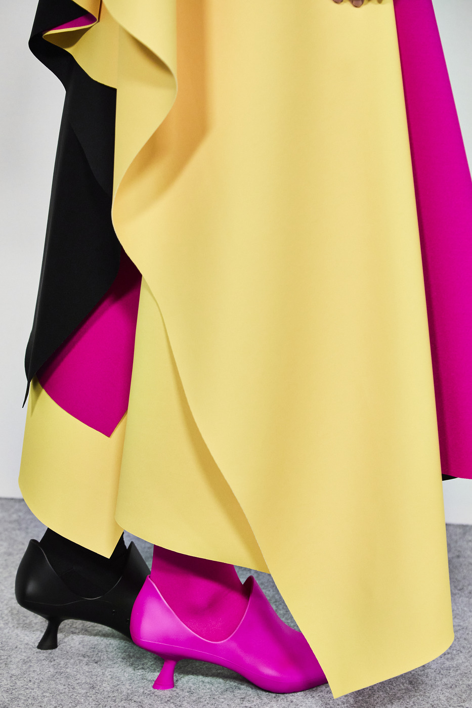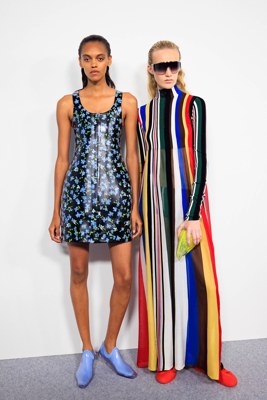 태양을 닮은 컬러는 컬렉션에 고스란히 반영되었다. 열로 봉합된 광택 나는 가죽 소재 종 모양 재킷부터 여러 겹의 스카프로 만든 드레이프 드레스까지, 솔기가 층층이 러플을 이루며 폭포수처럼 가늘게 흘러내렸다. 이 의상은 데님 팬츠, 버튼다운 셔츠, 티셔츠, 윈드브레이커 같은 전형적인 스포츠웨어와 함께 등장했다. “고도의 공예 기술로 재해석했죠.” 맥콜로가 말했다. 데님처럼 보인 팬츠는 사실 잘게 찢은 가죽 소재였고, 버튼다운 셔츠도 가죽 원단을 손으로 주름 잡고 채색한 것이었다. 탱크 톱과 티셔츠는 와이어를 섞은 가죽 ‘실’을 사용해 구겨진 형태를 입체적으로 표현했다. 다른 실험에는 더 고도의 기술이 적용되었다. 3D 프린팅 원단으로 만든 벨벳 촉감의 타월 드레스, 세계 최초의 실크 고어텍스 윈드브레이커가 그것이다.