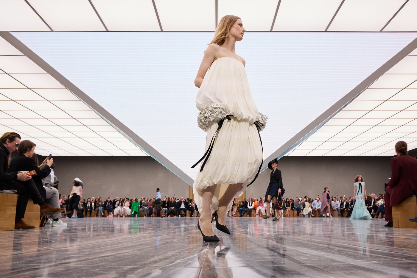 무슈 디올이 1952년 선보인 시갈(La Cigale, 매미라는 뜻) 드레스의 입체적이고 딱딱한 실루엣을 가장 가벼운 방식으로 재현한 것이다. 앤더슨은 오랫동안 그 실루엣에 매료되었다. 이 드레스는 디올이 상징하는 고전적인 ‘프린세스 판타지’에 대한 그의 생각을 구현한 것으로, 이런 면은 시폰 소재 버블 드레스와 스커트를 장식한 귀여운 은방울꽃 프린트나 자수에도 드러났다. 그러나 앤더슨은 가장 괴상하고 예상치 못한 걸 선보일 때 가장 혁신적이다. 얼굴의 반을 가리면서 레드 새틴 플리츠 톱 뒤로 폭포수같이 흘러내린 레이스처럼 말이다. 트리콘 모자와 볼륨 있는 카고 팬츠를 입은 모델은 디올 하우스의 패션 괴도처럼 보였다.