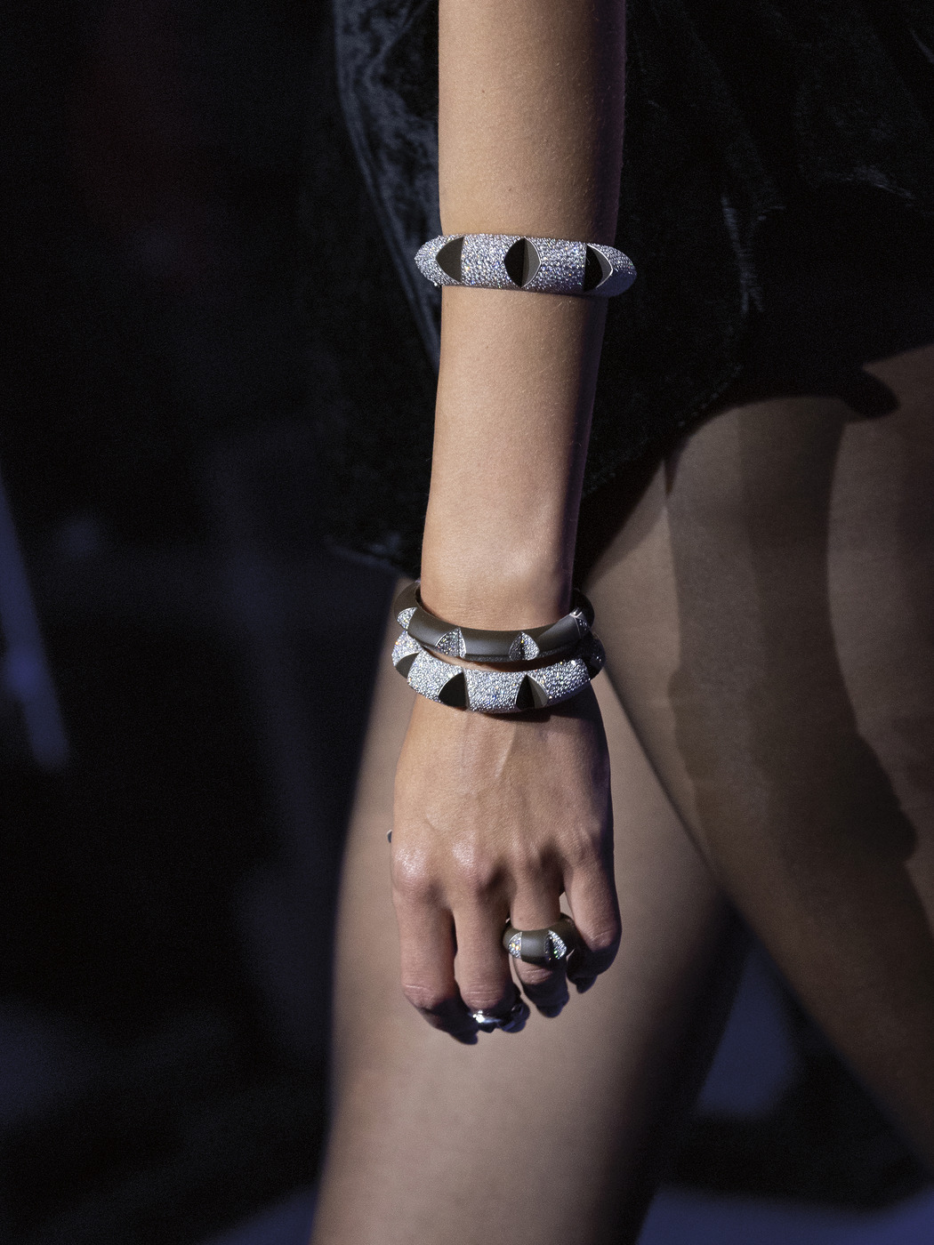 메시카는 거의 모든 인스타그램 게시물에 ‘#DiamondsInMotion’이라는 해시태그를 사용한다. 브랜드가 대중에게 처음 이름을 알린 계기는 레일에 다이아몬드를 세팅해 자유로이 움직일 수 있도록 만든 ‘무브(Move)’ 컬렉션이었다. 발레리는 “역동적인 움직임이 다이아몬드의 광채를 극대화한다”고 얘기한다. 착용한 채 몸을 움직여야만 진가가 드러나는 메시카 주얼리를 선보일 최적의 환경이 바로 패션쇼인 것이다. 이는 유명한 다이아몬드 상인의 딸로 태어나 일곱 살 무렵부터 다이아몬드를 갖고 놀았다는 발레리 메시카가 하이 주얼리를 ‘일상화’하려는 시도다.