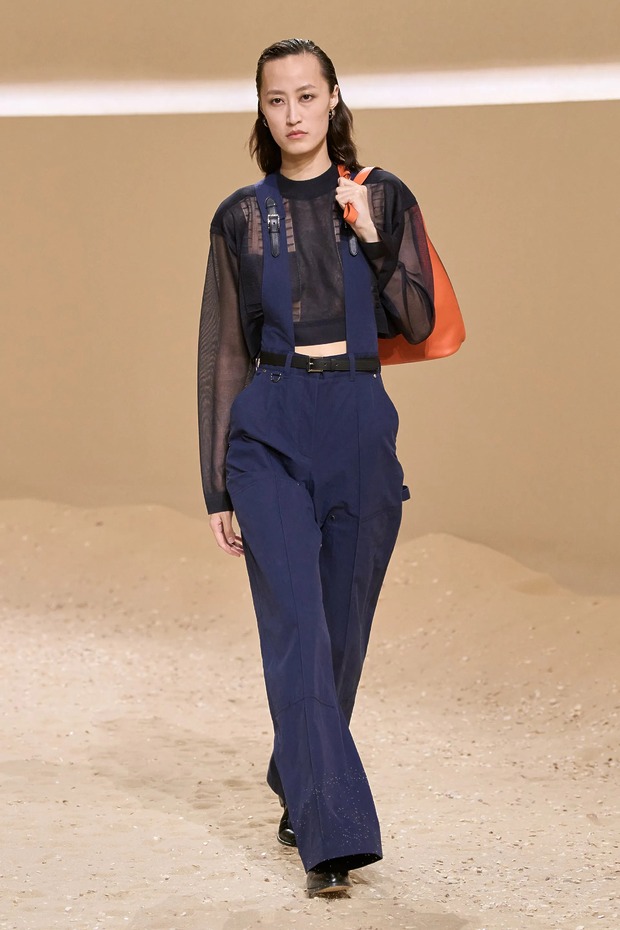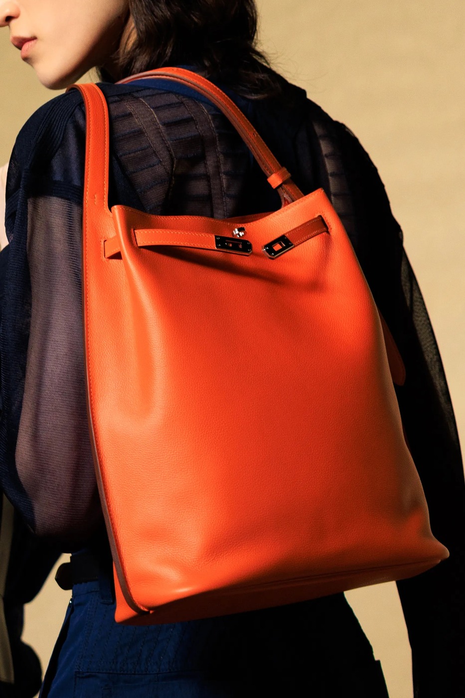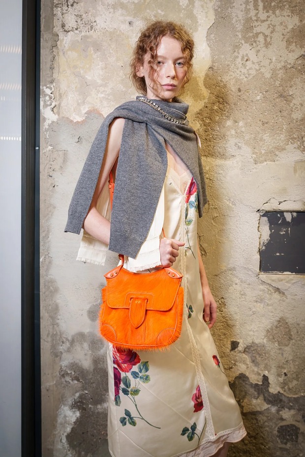 에르메스와 Nº21은 어깨에 메는 오렌지 백을 동시에 제안했죠. 에르메스는 상징적인 에르메스 컬러의 백을 네이비 블루 셋업과 매치해 컬러의 대조를 극대화했고요. Nº21은 란제리 드레스에 메신저 스타일의 백을 매치했죠.