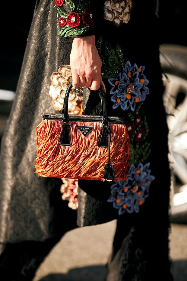 청바지와 오버사이즈 베스트로 구성된 룩에 추가할 수도 있고요. 가장 과장된 맥시멀리즘으로 착용할 수도 있습니다. 오렌지 깃털이 달린 프라다 갤러리아 백을 컬러 자수가 있는 블랙 레이스 코트와 결합해도 근사하죠.