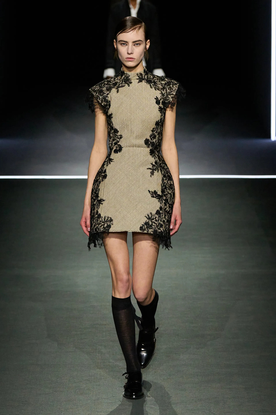 디올은 우아하면서도 포멀한 로퍼를 선보였습니다. 뾰족한 팁, 반짝이는 재질의 가죽, 그리고 측면에 위치한 버클이 특징으로 매우 절제된 느낌을 주죠. 이 블랙 슈즈는 로맨틱한 매력의 크리놀린 미니 드레스와 언밸런스한 조화를 이루며, 현대적이면서도 시대적 요소가 가미된 디올의 시그니처 스타일을 완성합니다. 여기에 긴 스타킹을 매치해 여성적인 매력을 더했네요.