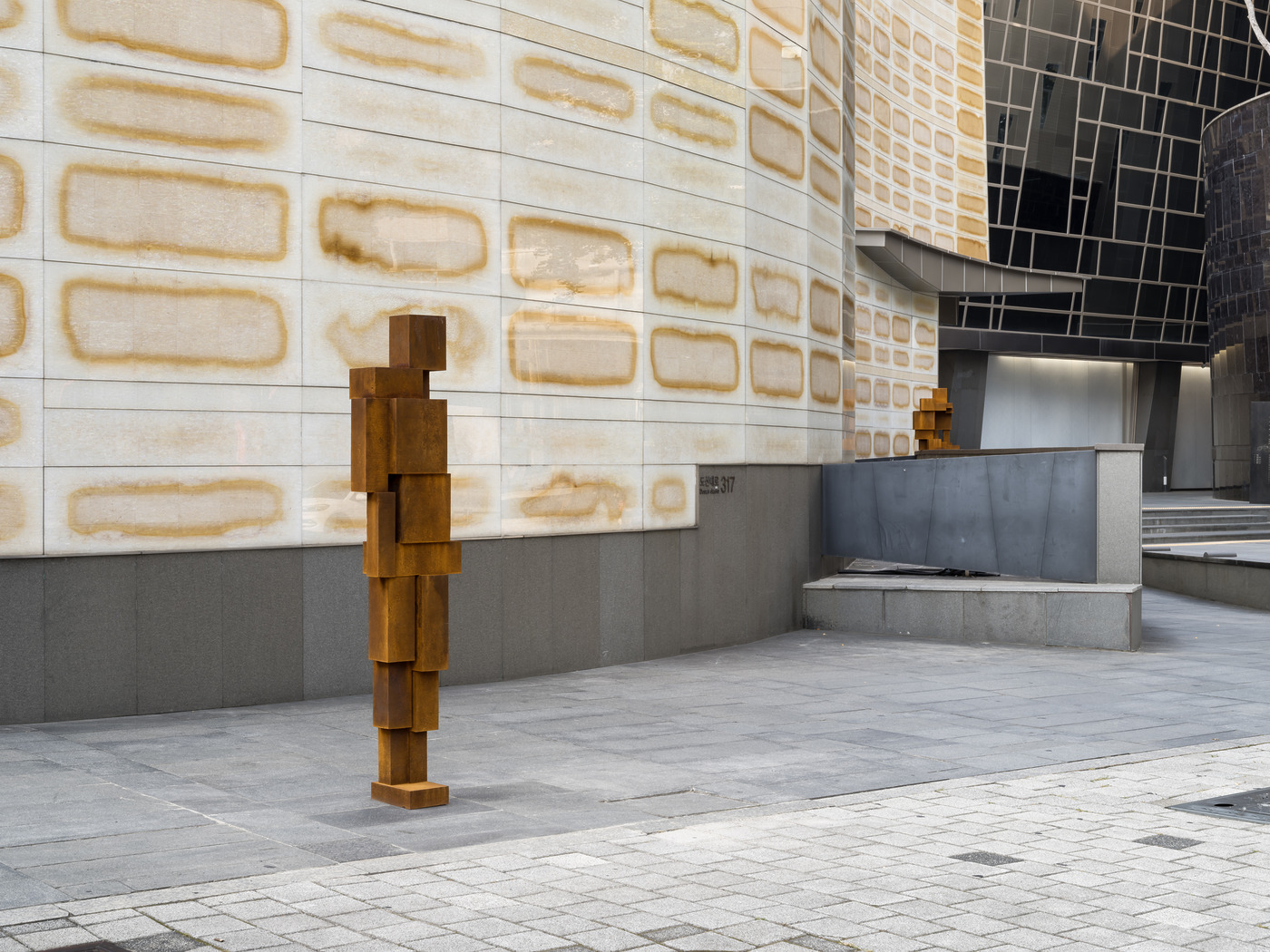 이 매혹적인 ‘불가분의 관계’를 구현하기 위해, 곰리는 서울이라는 도시 및 전시장의 구조를 백분 활용한 작업들을 선보입니다. 이를테면 타데우스 로팍 전시장에서 곰리는 조각을 신체의 경계를 넘어 그것이 점유한 공간의 가장자리까지 확장시킵니다. 수평으로 혹은 수직으로 길게 뻗어간 빈 공간을 만들어낸 ‘여기(Here)’, 그리고 ‘지금(Now)’이 전시의 중심을 잡아주는데요. 인간의 신체가 공간과 어떻게 상호작용하는지, 공간은 인간의 몸을 어떻게 품어내는지 느낄 수 있습니다. 한편 화이트 큐브 앞 인도와 차로 사이 연석 위에 세운 ‘몸틀기 IV(Swerve IV)’는 또 어떤가요. 길 가운데에서 보행자의 경로를 일시적으로 차단하고 그들의 일상에 순간 개입함으로써 인간과 예술, 예술과 도시의 감각 회로를 활성화합니다.