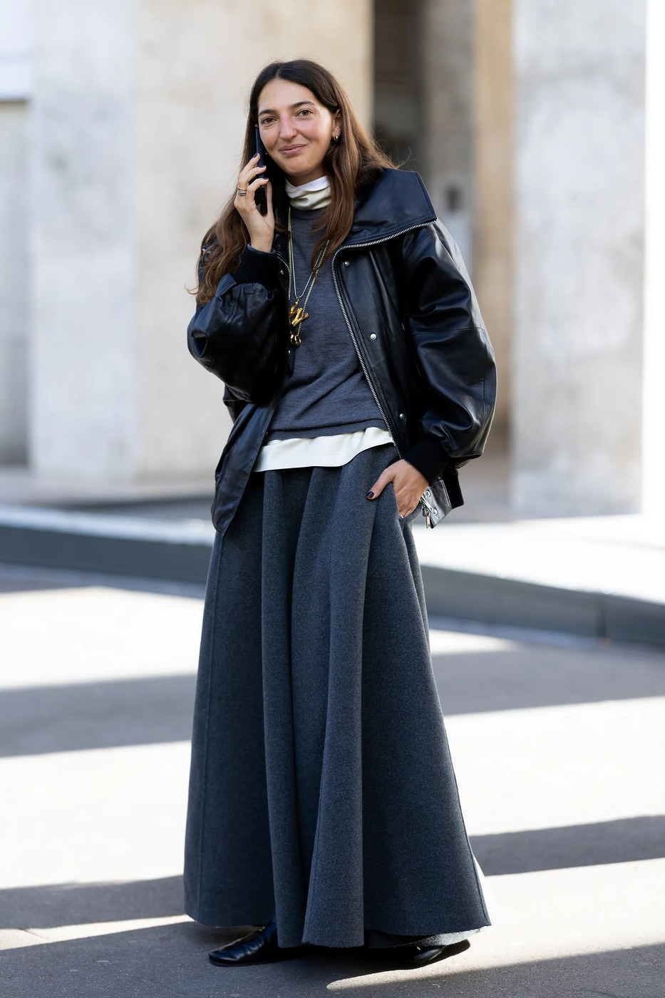 발목까지 내려오는 벙벙한 그레이 울 스커트 이야기입니다. 지난해까지만 해도 발목까지 내려오는 그레이 펜슬 스커트를 얘기했죠. 슬릿이 없으면 걷기 불편해 종종걸음으로 걸어야 하는 그 스커트요. 하지만 올겨울 들어서는 여유로운 실루엣의 스커트가 눈에 띕니다. 1990년대 유행했던 발목까지 내려오는 풍성한 느낌의 울 스커트 말이죠.