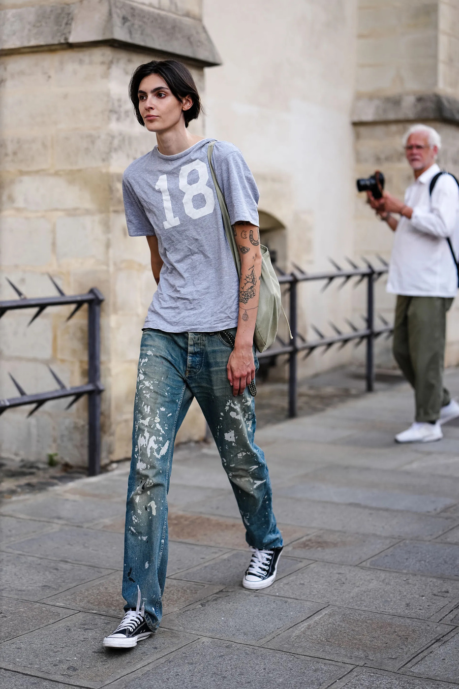 더욱 세련된 무드를 원한다면, 블랙과 그레이에 주목해보세요. 회색을 바탕으로 한 ‘데님 온 데님’ 위에 검은색 니트나 재킷을 걸친 뒤, 회색 컨버스를 신는 겁니다. 포인트는 신발에 묻은 얼룩만으로도 충분합니다.