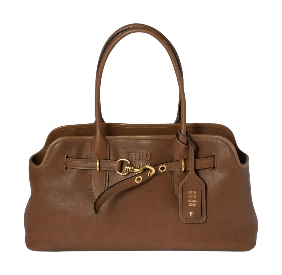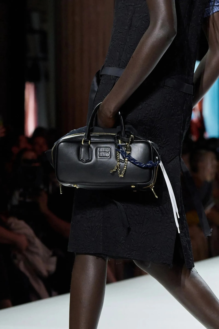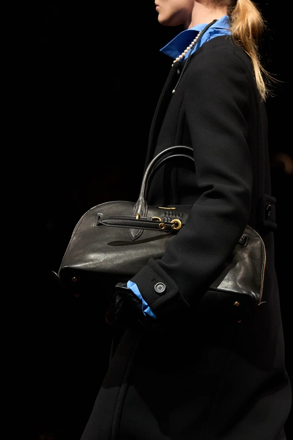아방뛰르는 전형적인 ‘레이디라이크’ 핸드백의 특징인 곡선형 실루엣의 톱 핸들을 차용했지만, 상단의 벨트 디테일과 금속 하드웨어가 미우미우만의 에지를 더했죠. 2009년 아카이브 스타일에서 영감을 받은 이 백은 2024 가을/겨울 쇼의 핵심이었습니다.