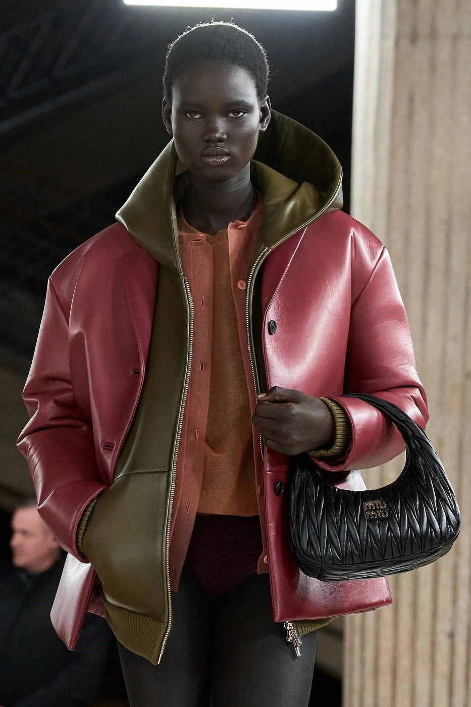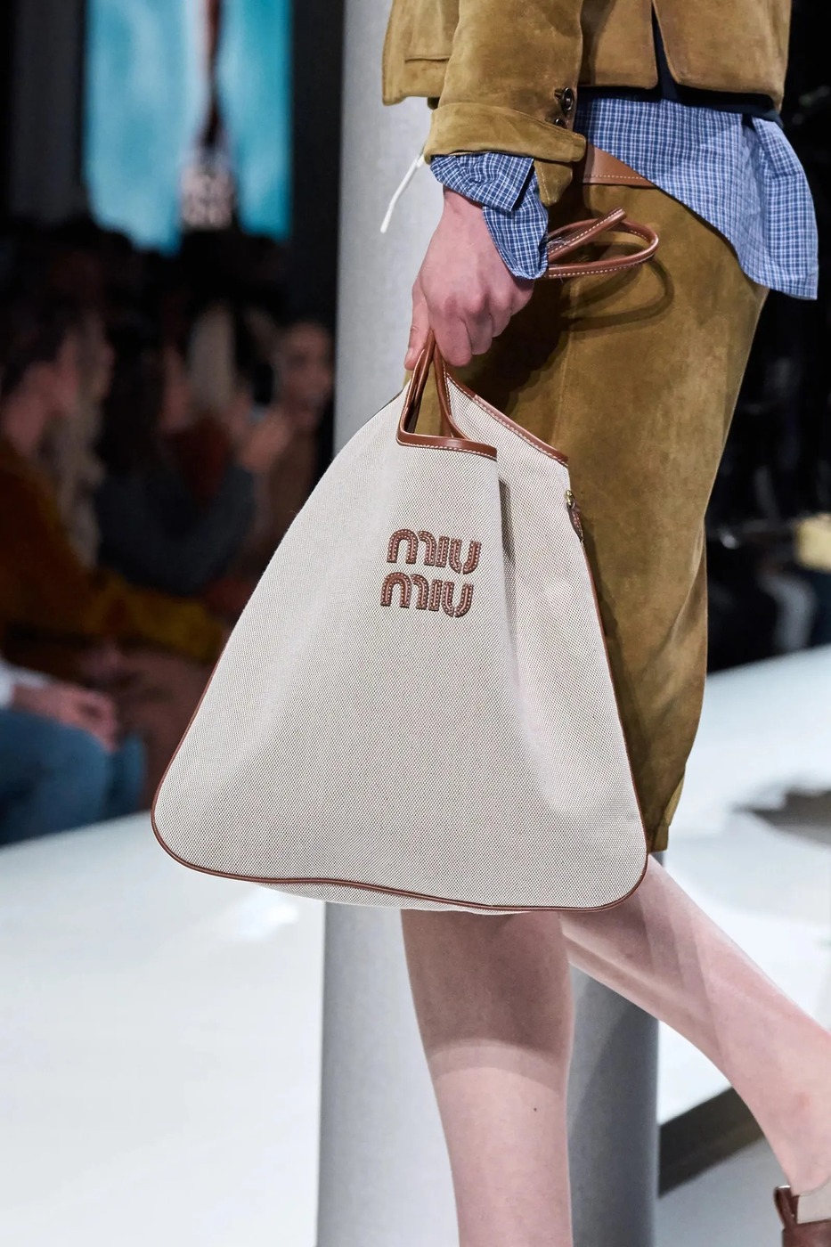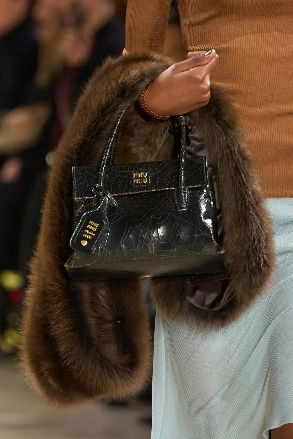 아방뛰르는 전형적인 ‘레이디라이크’ 핸드백의 특징인 곡선형 실루엣의 톱 핸들을 차용했지만, 상단의 벨트 디테일과 금속 하드웨어가 미우미우만의 에지를 더했죠. 2009년 아카이브 스타일에서 영감을 받은 이 백은 2024 가을/겨울 쇼의 핵심이었습니다.