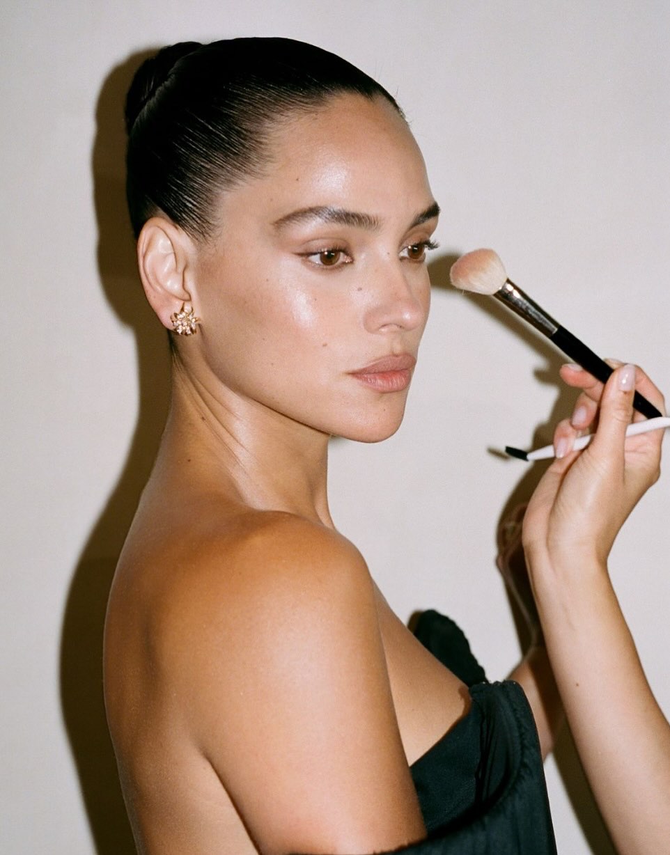 4단계 파우더 블러셔: 컬러를 레이어드하고 지속력을 높이는 단계입니다. 블러셔 대신 펄이 살짝 섞인 하이라이터를 사용하면 입체감이 한층 부각돼요.