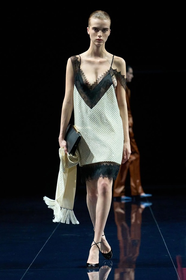 끌로에 런웨이에서는 움직임에 따라 레이스가 살랑대는 콤비 쇼트가 등장했습니다. 크리에이티브 디렉터 셰미나 카말리의 손길 아래 탄생한 아이템이죠. 연한 노란색의 실크와 순백의 레이스가 어우러져 한층 부드럽고 관능적인 무드를 선보입니다. 밤낮을 가리지 않고 완벽한 스타일이죠.