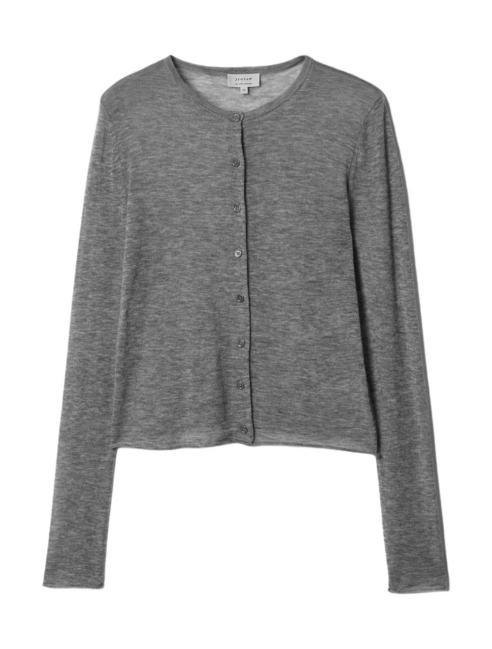 얇고 촘촘하게 짜인 그레이 카디건은 매일 입기 좋은 아이템입니다. 레이어링을 위해 나왔다고 해도 과언이 아니거든요. 화이트 탱크 톱, 플레어 진, 발레 플랫 슈즈만 준비하면 됩니다.