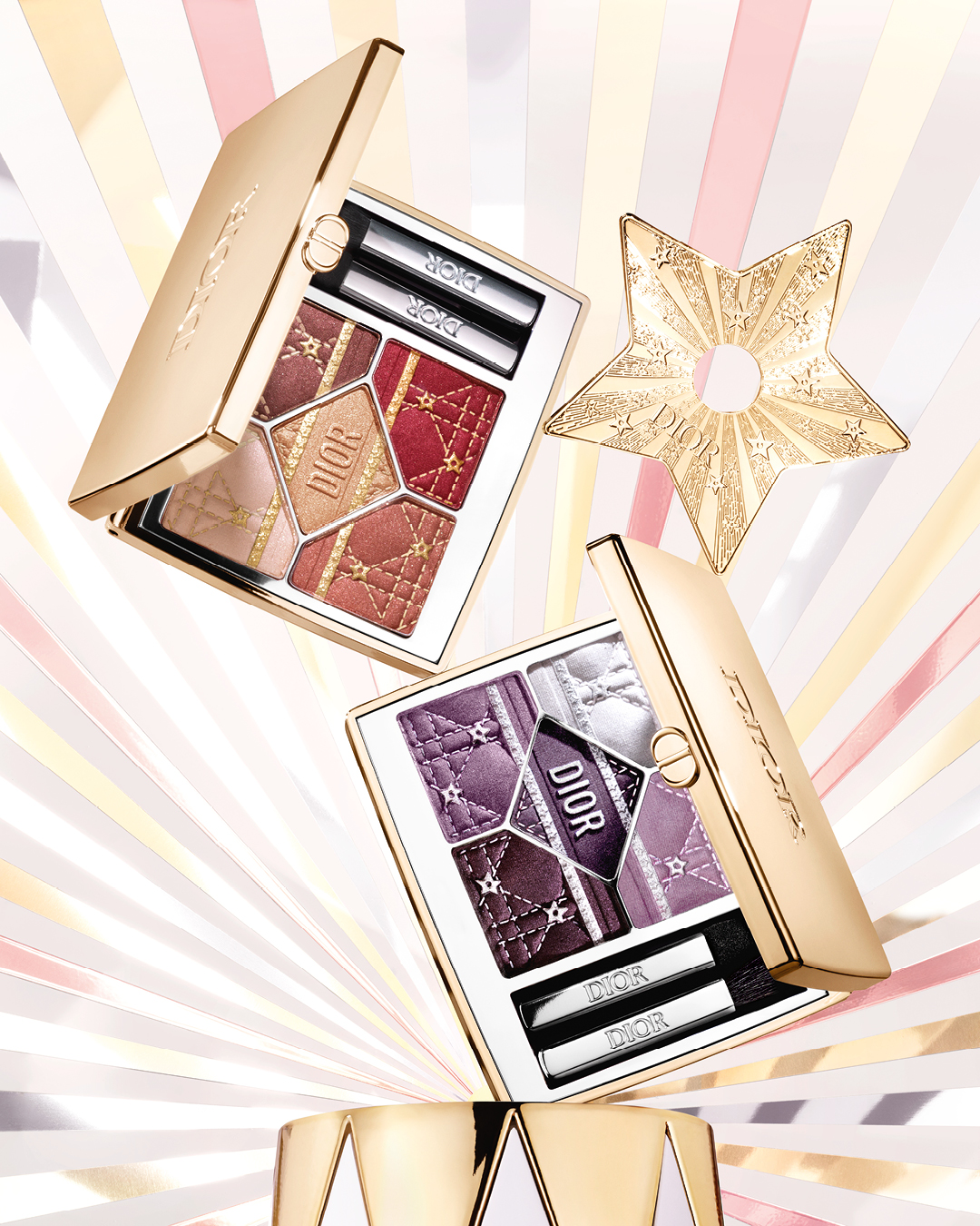 디올쇼 5 꿀뢰르는 별이 수놓인 까나쥬 패턴과 골드 케이스로 장식된 리미티드 에디션이다. 파우더 표면에 새겨진 실버와 골드 펄 피그먼트가 눈가에 스포트라이트를 비추는 듯한 화려함을 더한다. #636 파이어리 서커스는 골드, 코퍼, 레드 브라운 계열의 따뜻한 스펙트럼으로 이루어져 강렬한 홀리데이 무드를 완성하며, #912 플럼 퍼레이드는 실버, 라벤더, 딥 플럼으로 구성되어 세련되고 신비로운 플럼 룩을 완성한다.