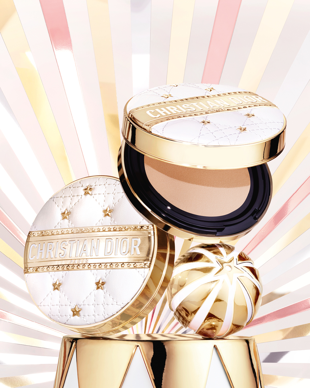 별빛이 수놓인 디올 포에버 쿠션 케이스는 이번 시즌의 하이라이트 중 하나다. 매혹적인 서커스에서 받은 영감을 바탕으로 골드빛 크리스챤 디올 밴드와 별, 그리고 아이코닉한 까나쥬 패턴으로 장식된 패션 아이템으로 재탄생했다. 디올 포에버 글로우 쿠션, 디올 포에버 루미너스 매트 쿠션, 디올 포에버 글로우 쿠션 메쉬까지 세 가지 쿠션 리필과 모두 호환되며, 각 리필은 피부 타입과 무드에 맞춰 다른 빛을 선사한다. 글로우 쿠션은 수분감 넘치는 자연스러운 윤광, 루미너스 매트는 벨벳처럼 부드러운 보송광, 메쉬 쿠션은 가볍고 산뜻한 투명 광채로 피부를 완성한다. 단순한 뷰티 제품을 넘어 하나의 오브제처럼 소장 가치를 더한다.