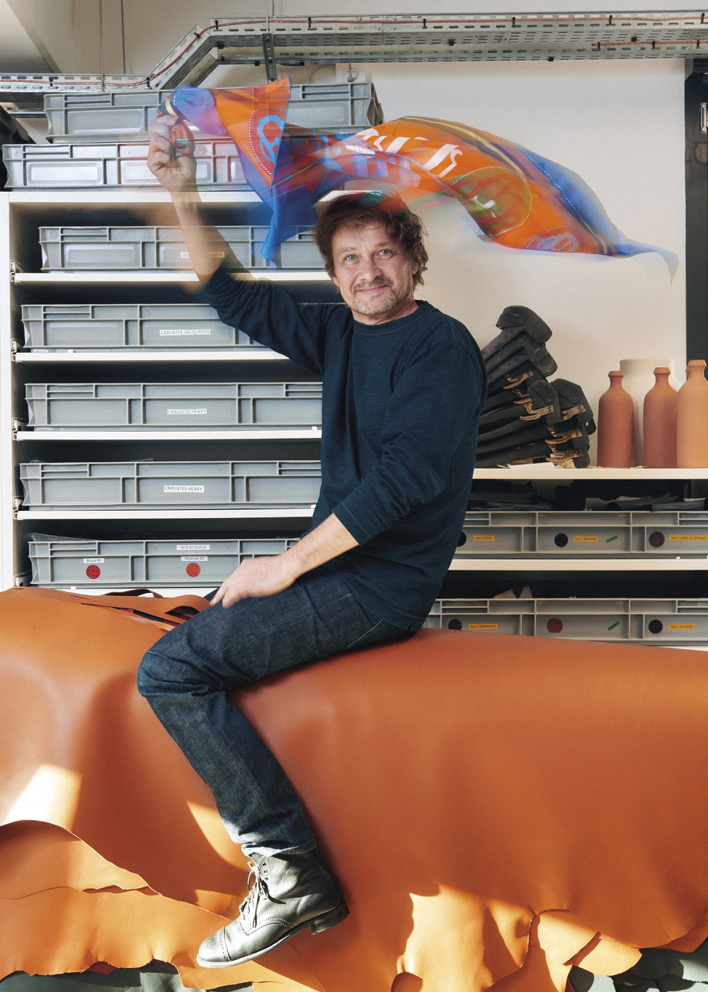고드프루아 쁘띠 아쉬는 에르메스가 아직 다루지 않은 새로운 재료를 발굴하고, 낯선 결합을 시도하죠. 라벨(Ravel) 도예 공방을 통해 흙과 가죽을 결합한 오브제를 제작한 적 있어요. 물성이 다른 두 재료가 만나니 수많은 이야기를 담아낼 수 있었죠. 쁘띠 아쉬는 실험실이자 만남의 장소입니다. 사람과 사람의 만남, 재료와 재료의 만남, 그리고 다양한 노하우의 만남이 이루어지면서 무한한 창작을 향해 나아가죠. 방한 중에 알게 된 여러 한국 장인의 기법도 마찬가지예요. 스튜디오 부분(Studio Booboon)과 함께 작업한 선반에 한국의 조각보 기법으로 수를 놓았죠.