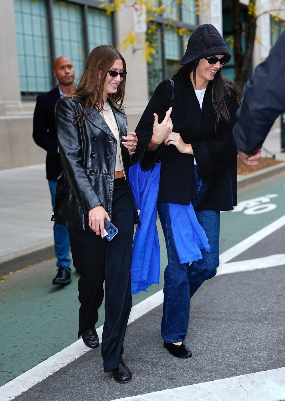 지난 10월 29일 켄달 제너와 헤일리 비버가 뉴욕 거리에 등장했습니다. 둘 다 무채색 기본 아이템을 착용했는데, 어딘가 한 끗이 남달랐죠. 켄달 제너는 청바지에 흰 티셔츠를 매치하고, 그 위에 블랙 코트를 걸쳤어요. 단정한 조합 같지만, 여유로운 실루엣과 길게 늘어진 소매가 만들어내는 비율이 룩에 숨을 불어넣습니다. 여기에 더 로우의 니트 버킷 햇과 레더 플랫 슈즈를 더해 차분하게 균형을 잡았죠. 플랫 슈즈는 여전히 ‘자연스럽지만 멋있는’ 룩의 핵심입니다. 발끝에서 힘을 뺀 대신, 길게 늘어뜨린 블루 스카프로 시선을 위로 끌어올렸어요. 목에 둘러도, 가방에 무심히 걸쳐도 분위기를 환기하죠.