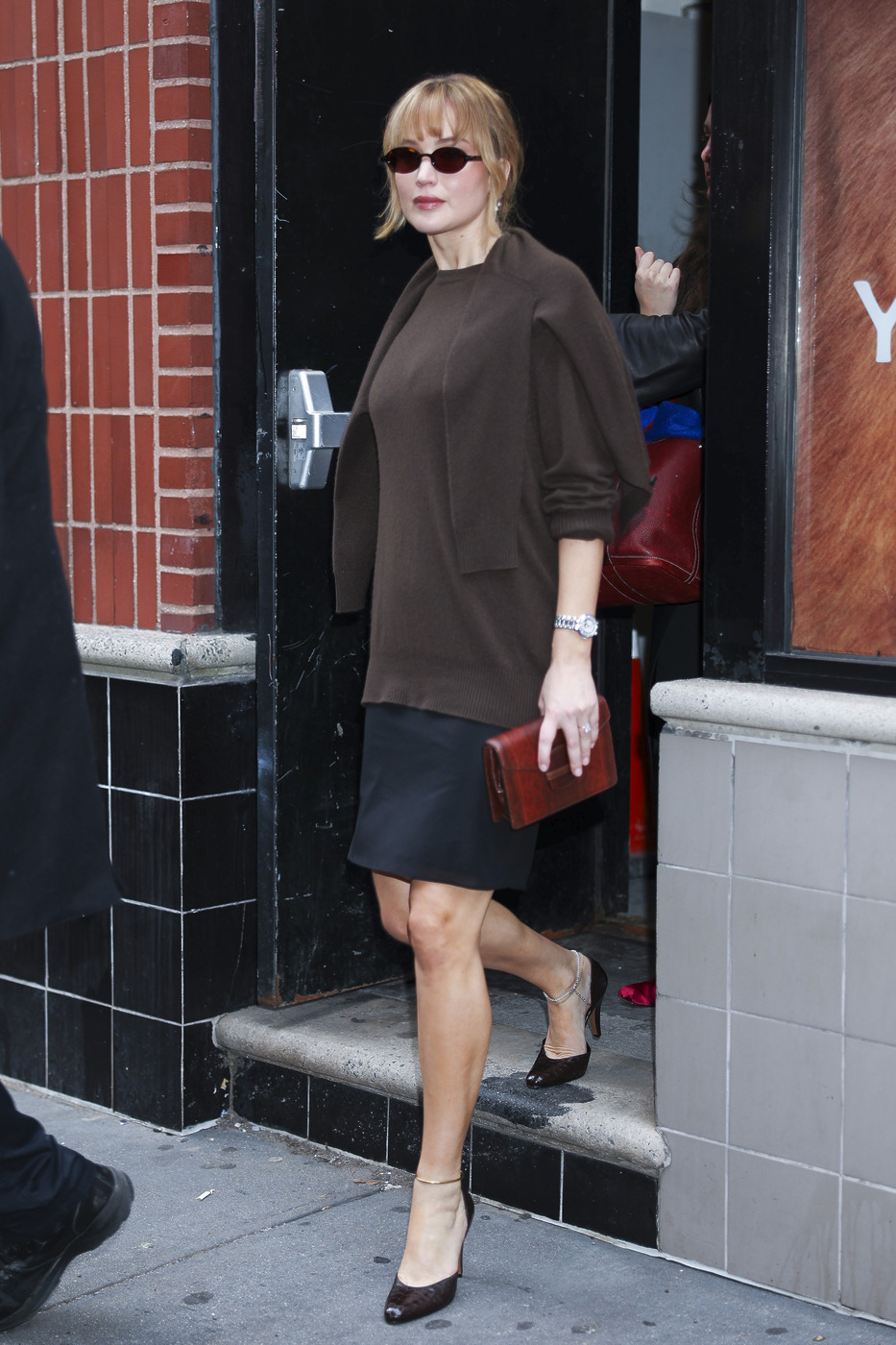 지난주 뉴욕에서 열린 론진 부티크 오프닝에 모습을 드러낸 제니퍼는 초콜릿 브라운 니트 스웨터에 트윈셋 카디건을 어깨에 걸쳤습니다. 무엇보다 눈에 띈 건 블랙 미디 펜슬 스커트와 발목에 골드 서클 스트랩이 달린 힐이었어요. 함께 매치한 액세서리는 룩에 더할 나위 없는 우아함을 더했습니다. 붉은빛이 도는 브라운 클러치 백, 지미 페어리 오벌 선글라스, 소피 부하이 이어링까지! 머리는 흐드러진 듯 묶고, 부드러운 제인 버킨 뱅 헤어로 마무리했습니다.