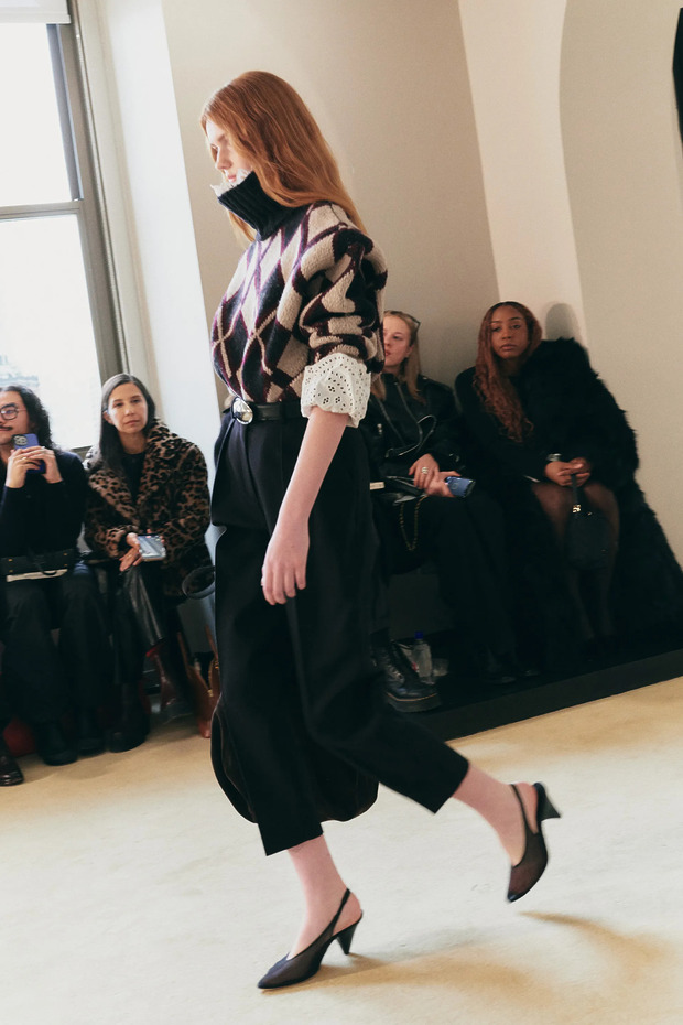 로에베로 떠난 잭 & 라자로 듀오의 마지막 프로엔자 스쿨러 컬렉션에서도 아가일 니트를 찾아볼 수 있었습니다. 캐주얼한 분위기를 자아내는 와이드 코듀로이 팬츠와의 오묘한 조합이 흥미로웠죠.