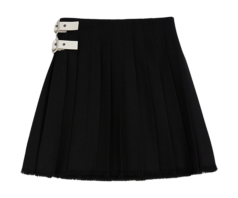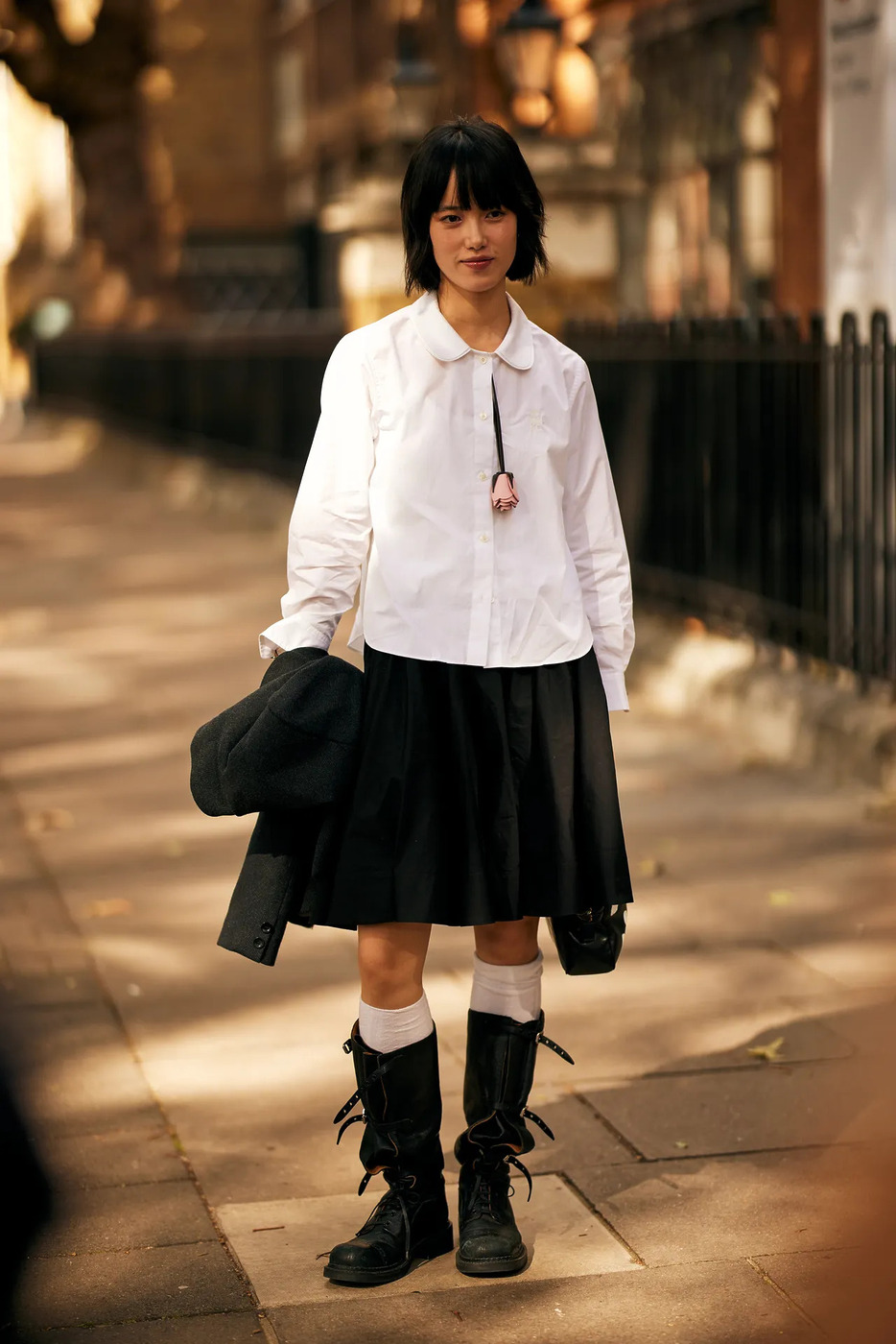 바이커 부츠는 터프한 매력이 있죠. 그래서 옷을 얌전하게 입을수록 반전 매력이 배가됩니다. 무릎 위를 스치는 플리츠스커트에 블라우스를 챙겨 입고, 바이커 부츠로 반전을 줘보세요. 컬러가 얌전하니 버클 디테일을 추가해도 낯간지럽지 않습니다.