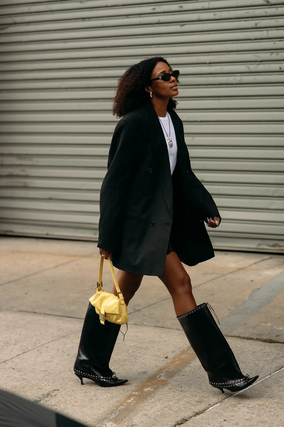 실패하기가 더 어려운 조합이죠. 미니멀한 실루엣의 블랙 부츠를 무채색 미니스커트에 매치해보세요. 그레이 스커트도, 블랙 스커트도 좋습니다. 스커트의 심플하고 시크한 분위기를 룩 전체로 끌고 가거나, 톱 또는 백에 좋아하는 컬러를 넣어 포인트를 줘보세요.
