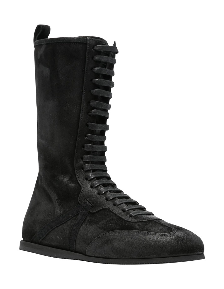블랙핑크가 올해 자주 신은 컴뱃 부츠와 흡사하죠. 복싱 부츠는 그보다 가볍지만 시각적인 임팩트는 충분합니다. 스커트 패턴이 복잡해도 괜찮아요. 오히려 부츠의 강한 존재감이 패턴의 산만함을 눌러주니까요.
