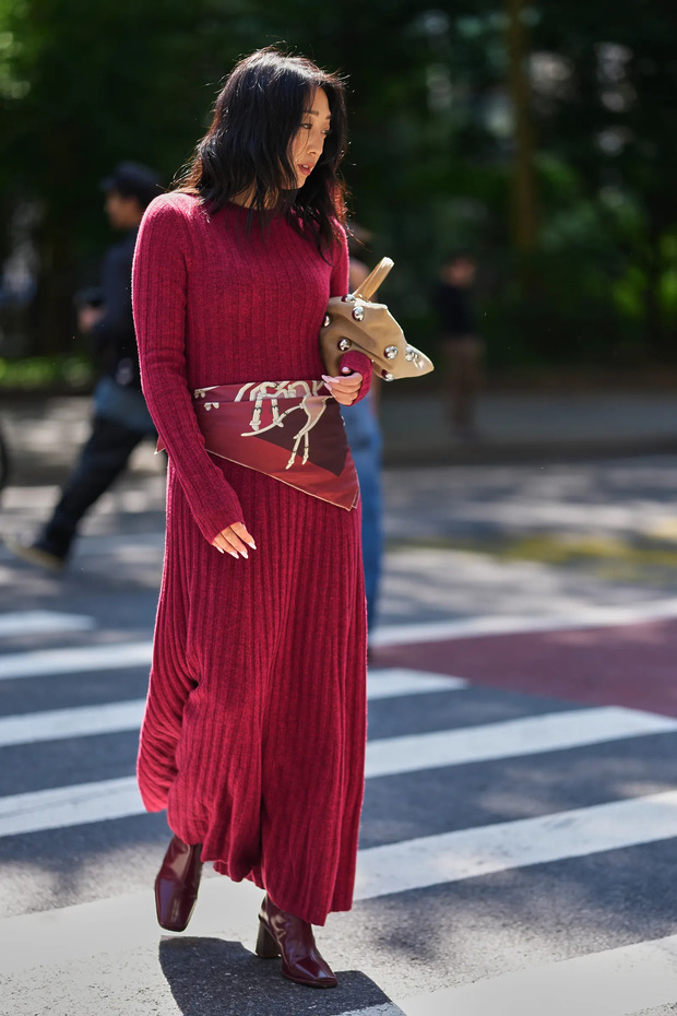 2024 가을/겨울 시즌 런웨이는 진홍색 가방으로 가득했습니다. 구찌, 샤넬, 미우미우, 루이 비통, 페라가모 등 우리가 알고 있는 거의 모든 럭셔리 하우스에서 버건디 백을 선보였죠. 버건디 컬러 아이템이 더없이 고혹적인 포인트가 되어준다는 점, 그리고 대부분의 ‘겨울 컬러’와 잘 어울린다는 점을 알 수 있었습니다. 지난 9월 초부터 10월 초까지 진행된 2026 봄/여름 시즌 컬렉션에서도 버건디 레더를 찾을 수 있었습니다. 가방이 아닌 신발에서! 그리고 캣워크 위가 아닌 거리에서 말이죠. 부츠 역시 백 못지않은 활용도와 우아함을 자랑하더군요. 데일리 룩에 쉽게 녹여낼 수 있는 것은 물론이고요.