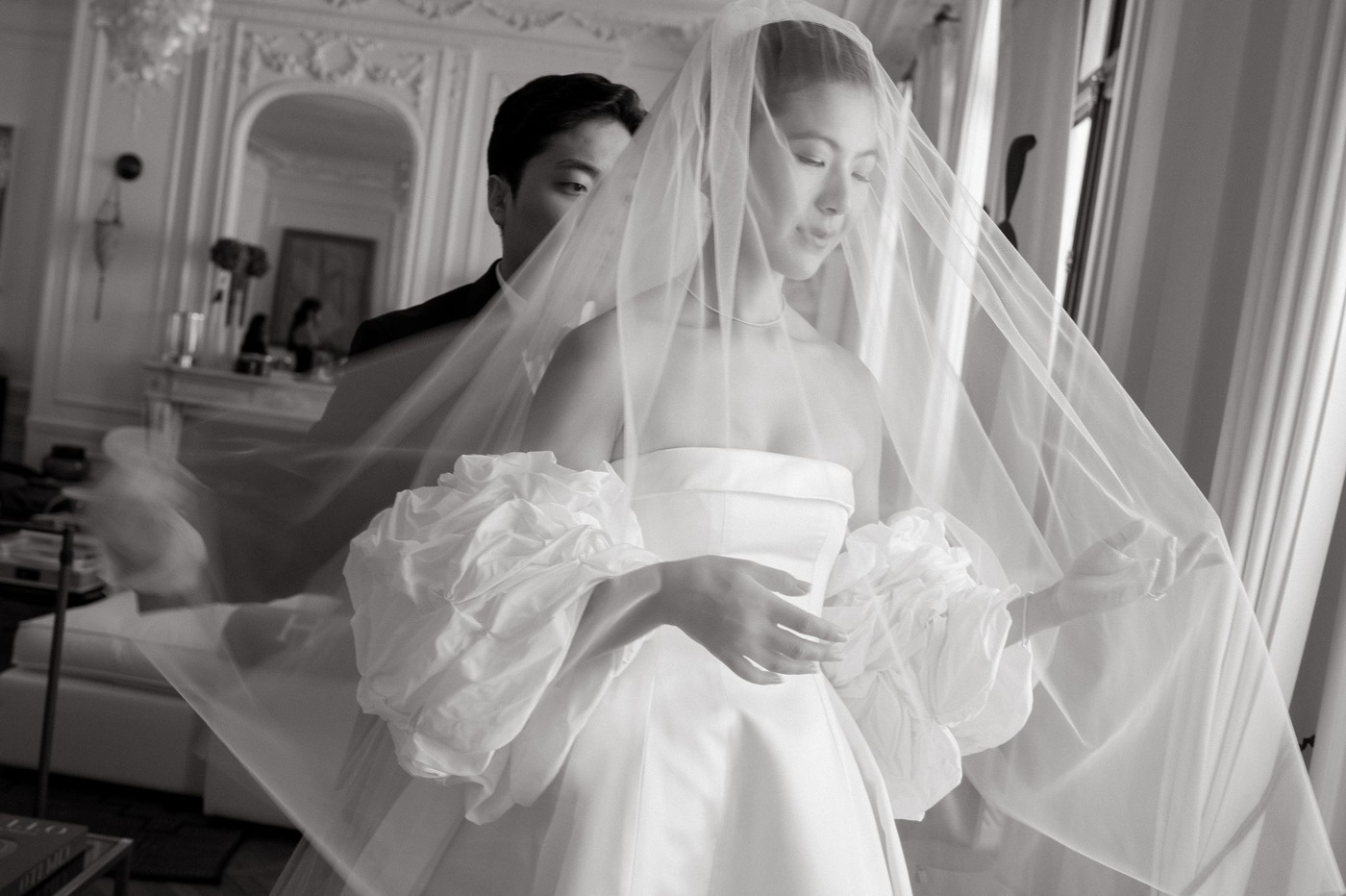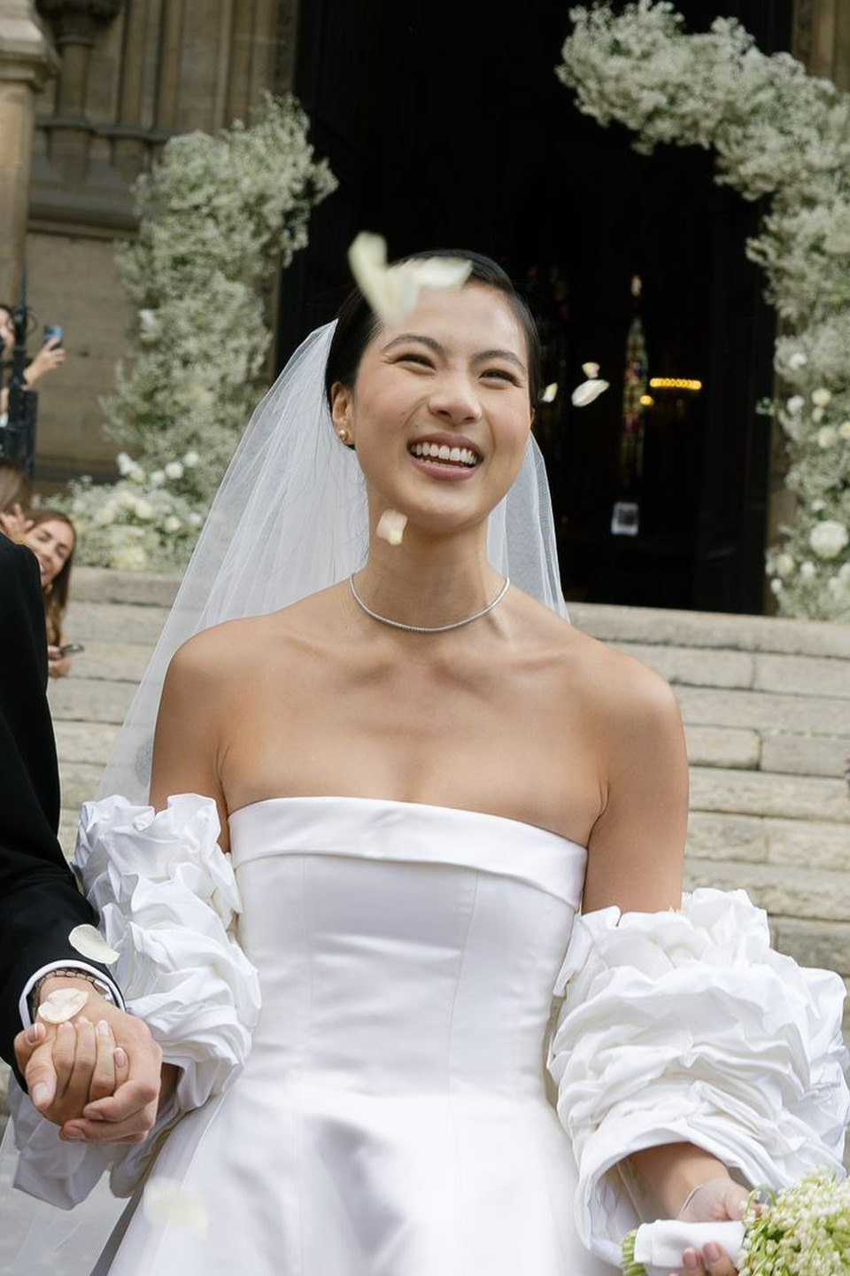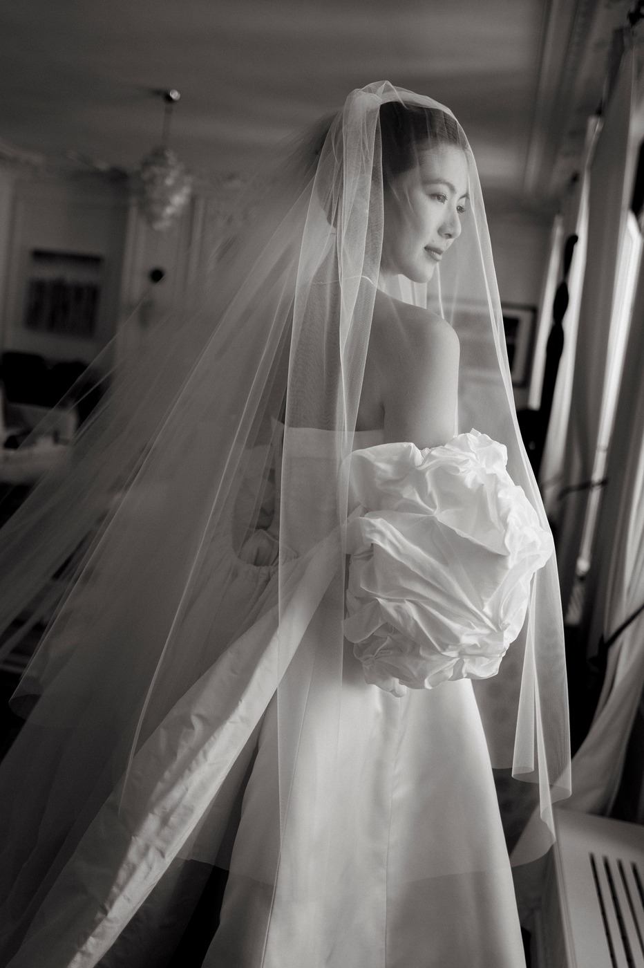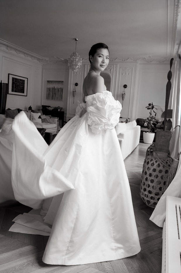 며칠 후, 다혜 씨는 앤드루 권의 예전 웨딩 컬렉션을 스크롤하다가 위풍당당한 태피터 소재 케이프를 발견했습니다. 그녀는 곧장 예전에 입어본 그 드레스와 함께 입어볼 수 있을지 물었죠. “제가 방문했을 때 입어볼 수 있는 샘플은 검정색밖에 없었어요. 하지만 직원들이 흰색 케이프였다면 어떤 모습이 될지 이미지를 편집해서 보여줬어요. 믿음을 갖고 그대로 가기로 했죠.” 앤드루 권의 팀은 드레스에 완벽하게 어울리는 색상을 찾기 위해 흰 태피터로 수십 벌의 샘플을 만들었습니다. 또 구조를 만들고 봉제를 하는 데 수많은 시간을 투자했습니다. 그 결과 클래식하고, 시대를 초월하며, 그러면서도 대성당에 어울리는 긴 베일과 주름진 태피터 케이프 덕분에 극적인 매력까지 있는 드레스가 탄생했습니다. 다혜 씨가 시중에서 본 그 어떤 드레스와도 달랐습니다.