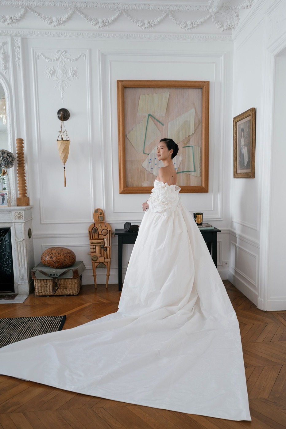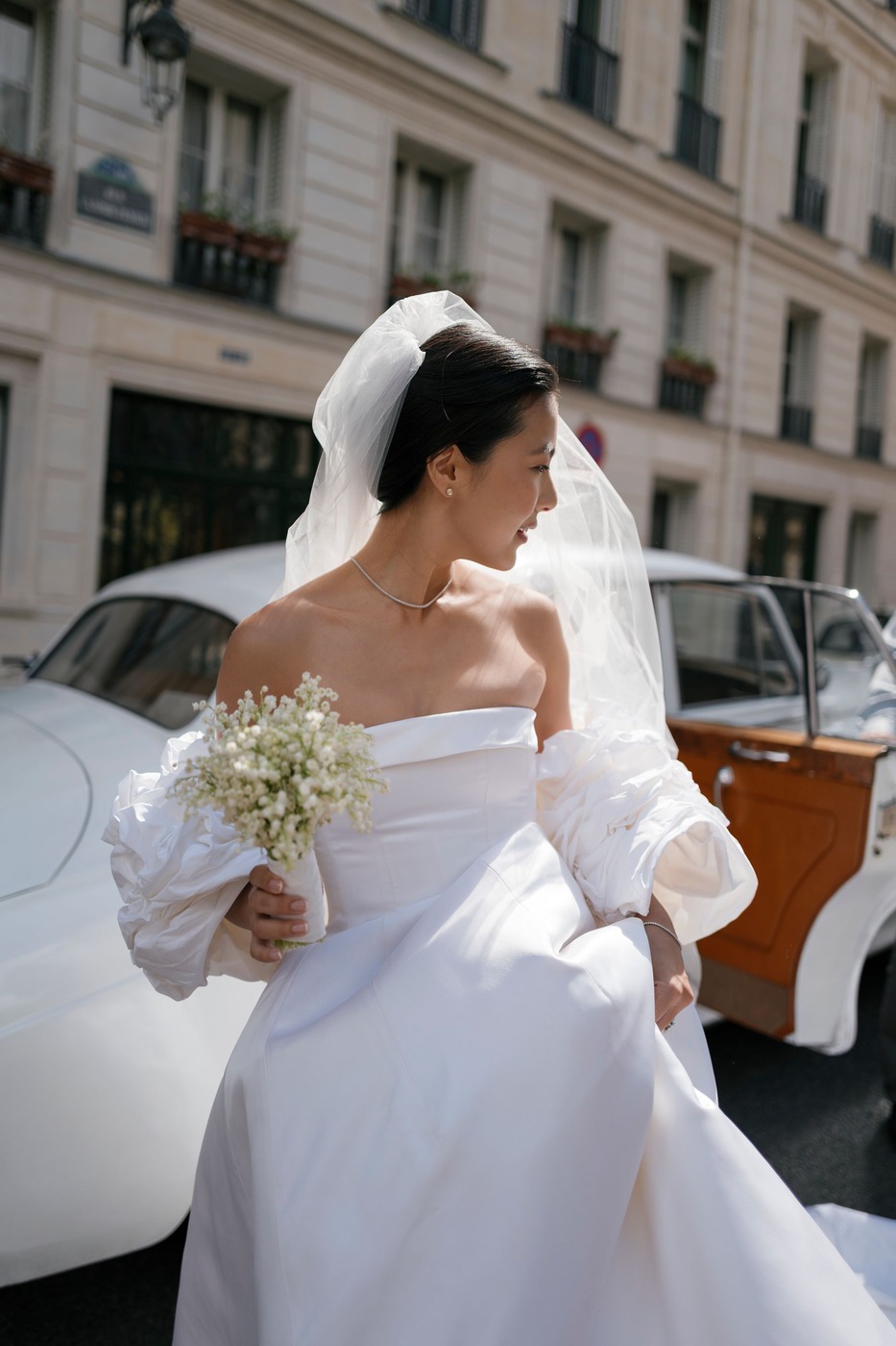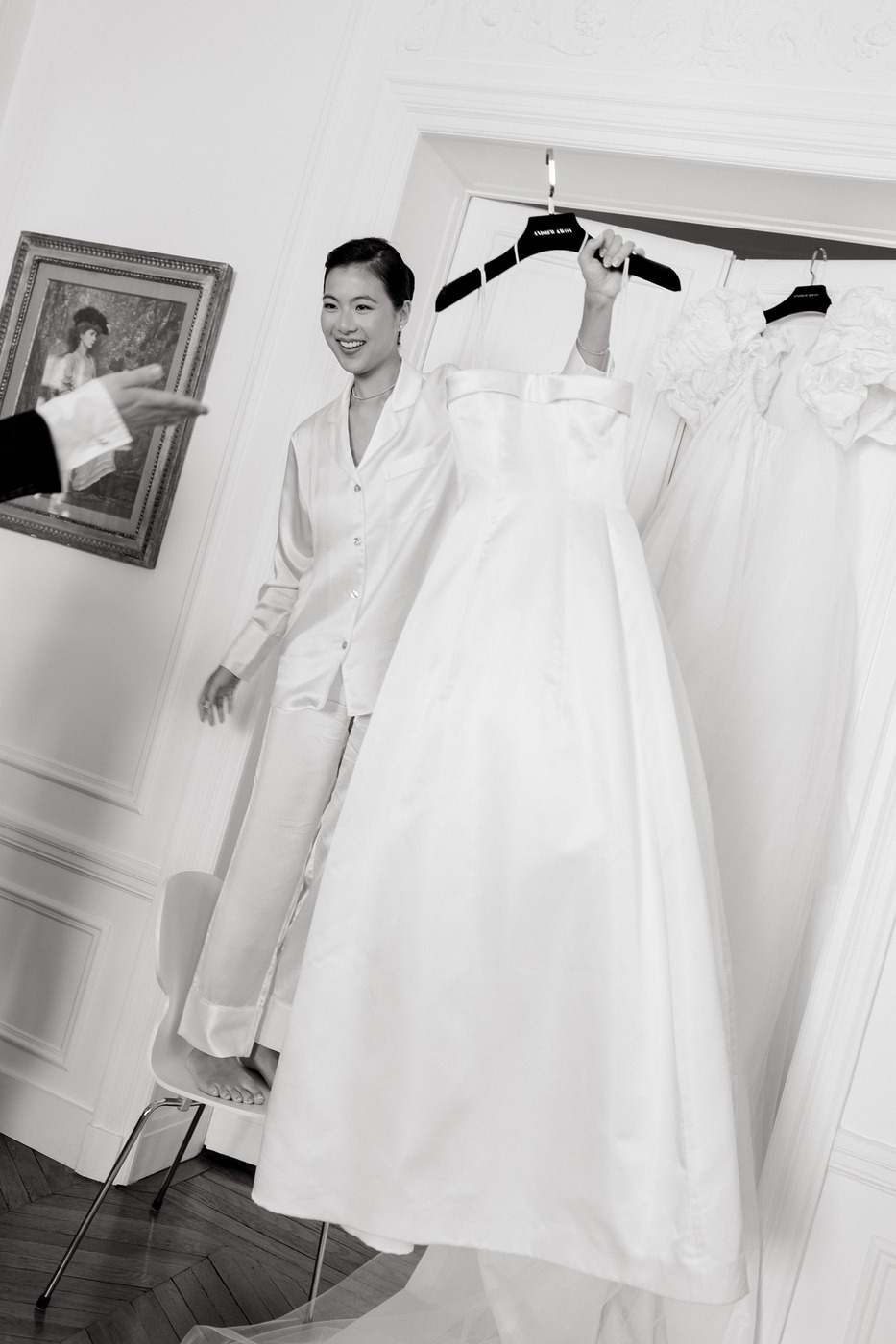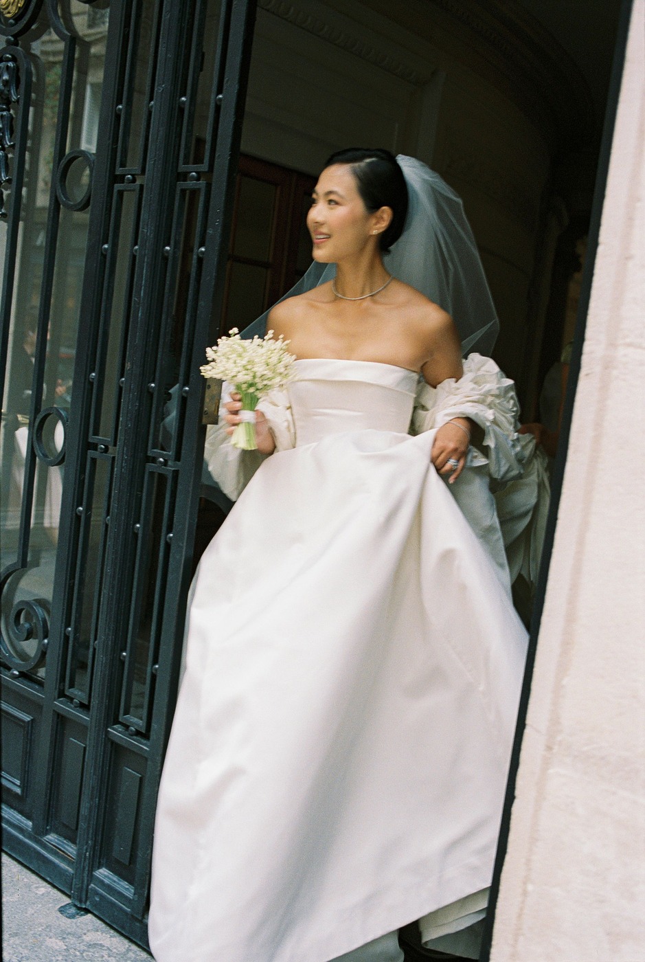 며칠 후, 다혜 씨는 앤드루 권의 예전 웨딩 컬렉션을 스크롤하다가 위풍당당한 태피터 소재 케이프를 발견했습니다. 그녀는 곧장 예전에 입어본 그 드레스와 함께 입어볼 수 있을지 물었죠. “제가 방문했을 때 입어볼 수 있는 샘플은 검정색밖에 없었어요. 하지만 직원들이 흰색 케이프였다면 어떤 모습이 될지 이미지를 편집해서 보여줬어요. 믿음을 갖고 그대로 가기로 했죠.” 앤드루 권의 팀은 드레스에 완벽하게 어울리는 색상을 찾기 위해 흰 태피터로 수십 벌의 샘플을 만들었습니다. 또 구조를 만들고 봉제를 하는 데 수많은 시간을 투자했습니다. 그 결과 클래식하고, 시대를 초월하며, 그러면서도 대성당에 어울리는 긴 베일과 주름진 태피터 케이프 덕분에 극적인 매력까지 있는 드레스가 탄생했습니다. 다혜 씨가 시중에서 본 그 어떤 드레스와도 달랐습니다.