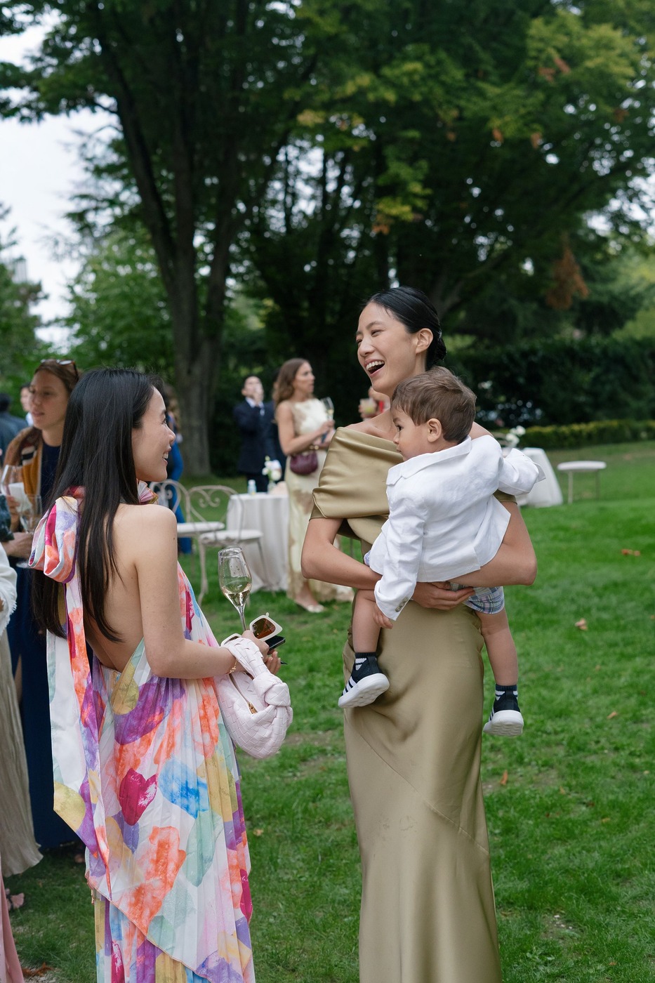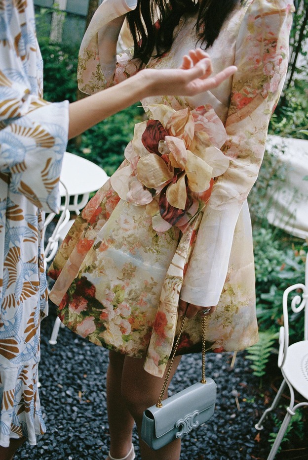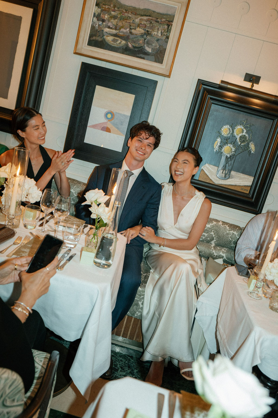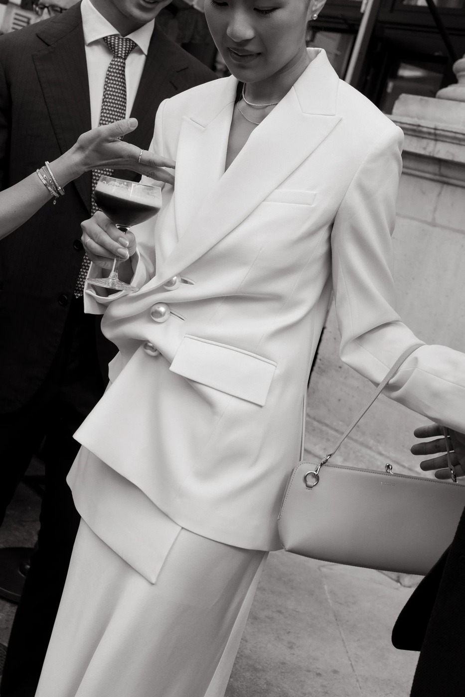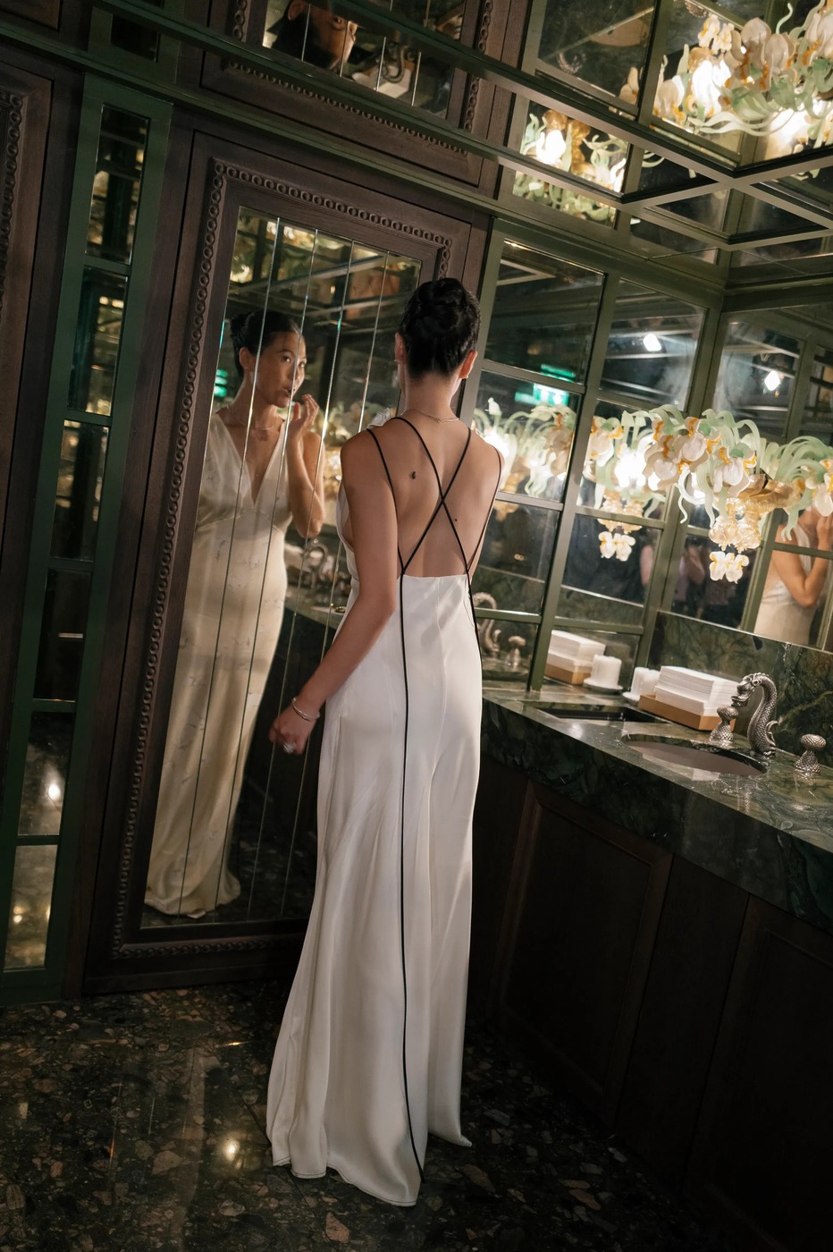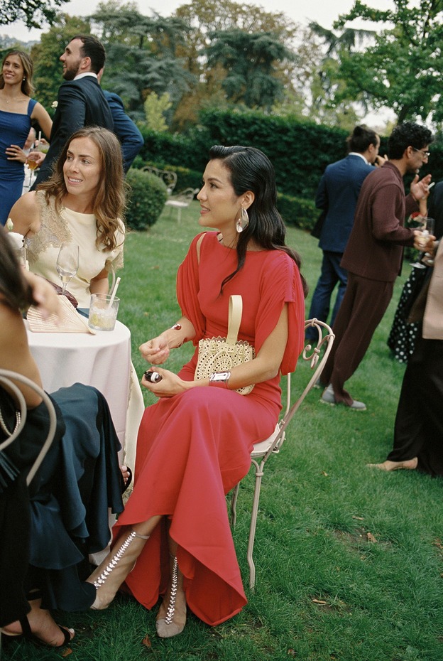 다혜 씨는 결혼식 첫 행사였던 이 전야 만찬 자리에서 빅토리아 베컴의 드레스를 입었습니다. “클래식한 라인과 의외의 디테일이 서로 완벽하게 조화를 이루는 드레스였어요. 유행을 타지 않는 몸에 붙는 실루엣의 새틴 드레스지만, 십자형 블랙 스트랩과 바닥까지 내려오는 트레인 같은 현대적 터치가 가미된 게 너무 마음에 들었죠.” 다혜 씨는 한국 브랜드 김해김(Kimhekim)의 블레이저도 입었습니다. “몇 년 동안 눈여겨봐온 브랜드예요. 클래식한 블레이저인데, (그러면서도) 앞에 페미닌한 셔링 장식과 진주 디테일이 있죠.”