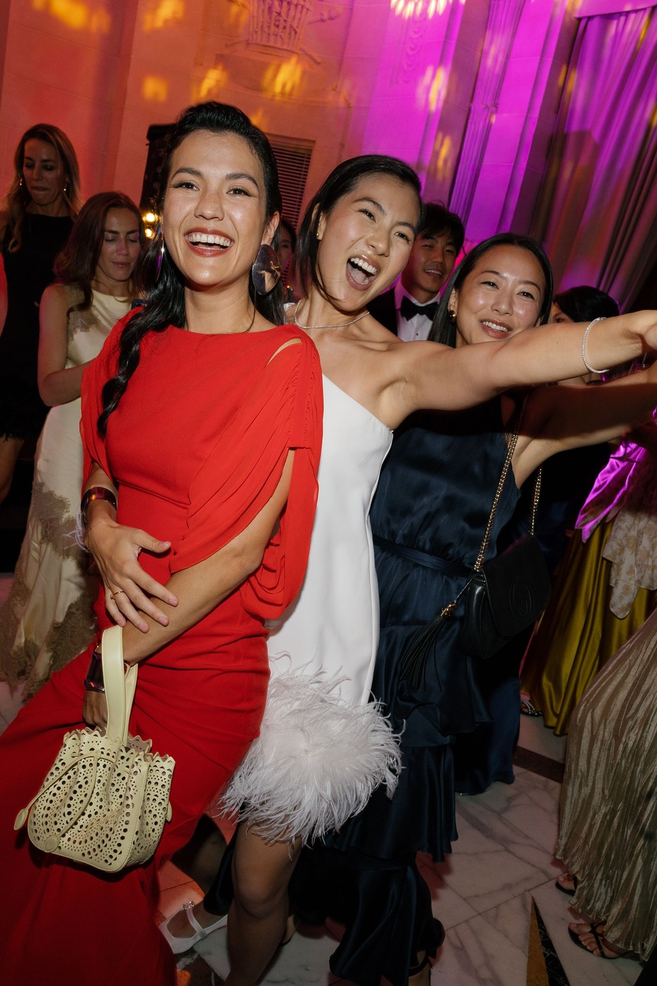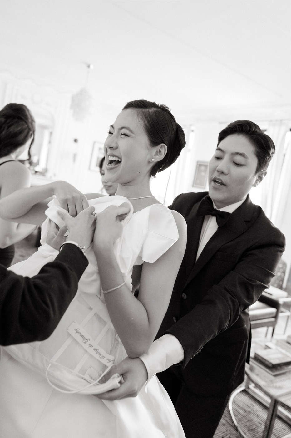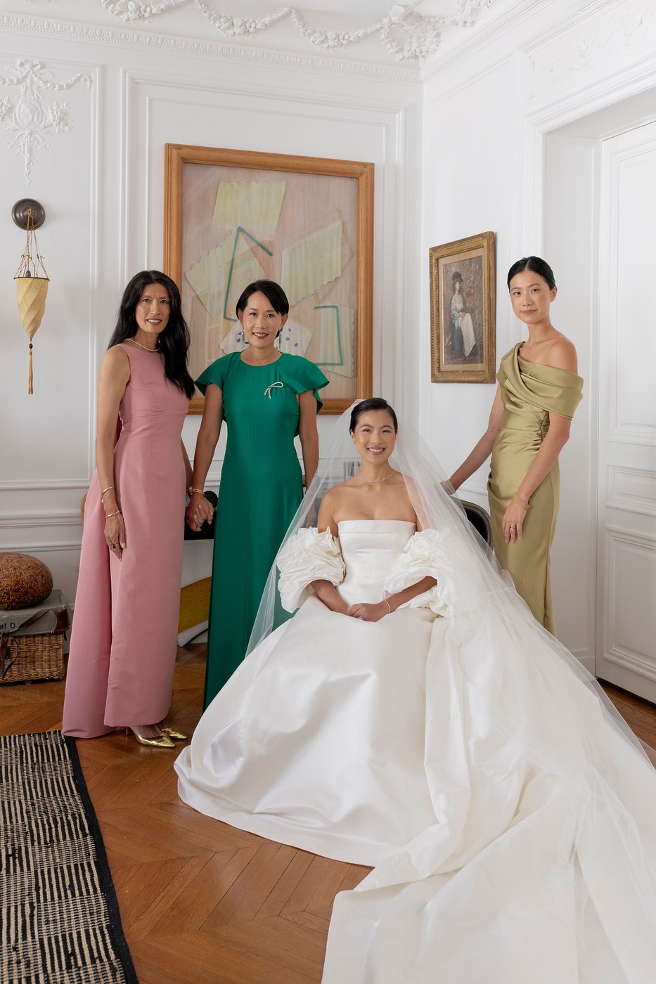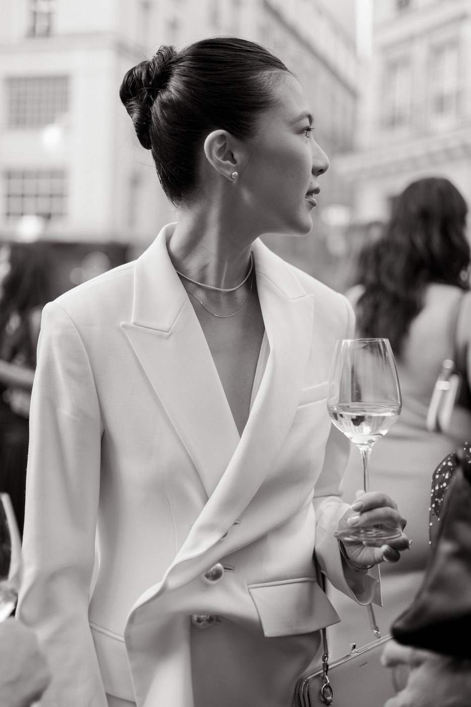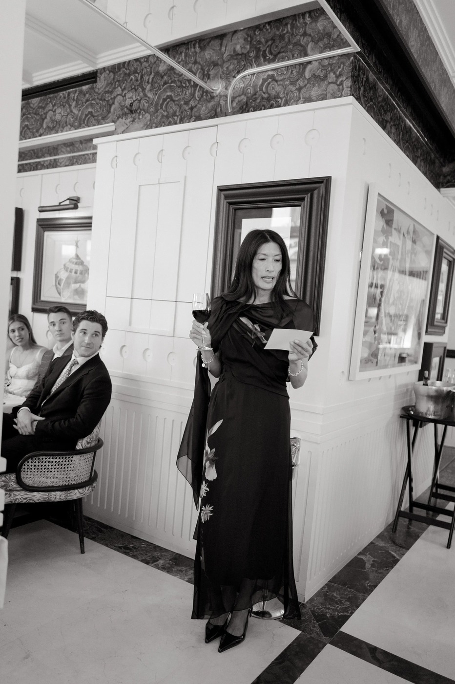 다혜 씨는 결혼식 첫 행사였던 이 전야 만찬 자리에서 빅토리아 베컴의 드레스를 입었습니다. “클래식한 라인과 의외의 디테일이 서로 완벽하게 조화를 이루는 드레스였어요. 유행을 타지 않는 몸에 붙는 실루엣의 새틴 드레스지만, 십자형 블랙 스트랩과 바닥까지 내려오는 트레인 같은 현대적 터치가 가미된 게 너무 마음에 들었죠.” 다혜 씨는 한국 브랜드 김해김(Kimhekim)의 블레이저도 입었습니다. “몇 년 동안 눈여겨봐온 브랜드예요. 클래식한 블레이저인데, (그러면서도) 앞에 페미닌한 셔링 장식과 진주 디테일이 있죠.”
