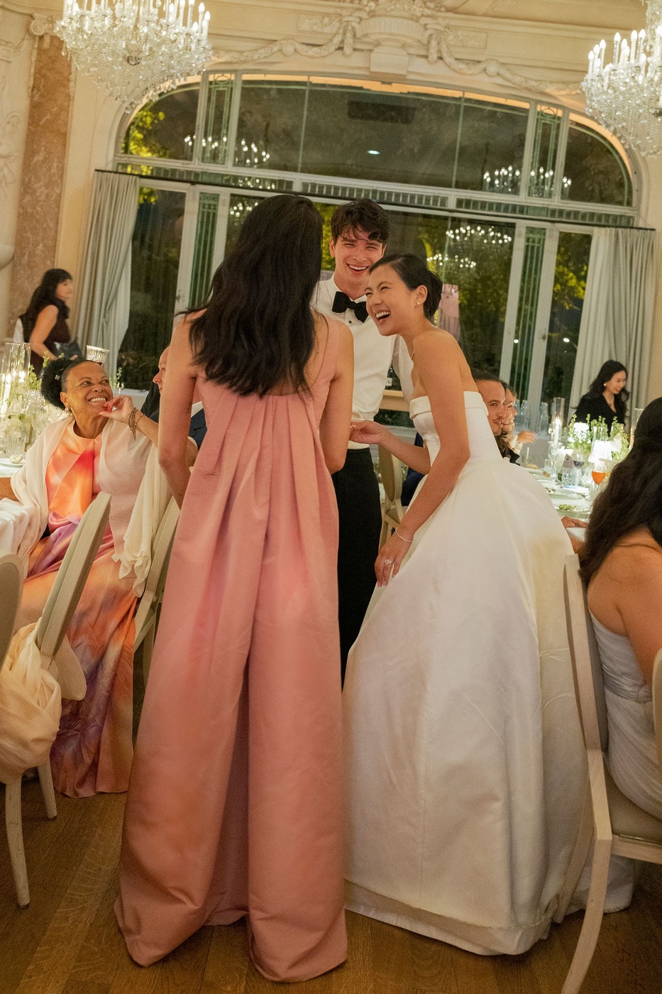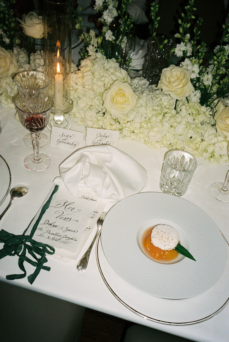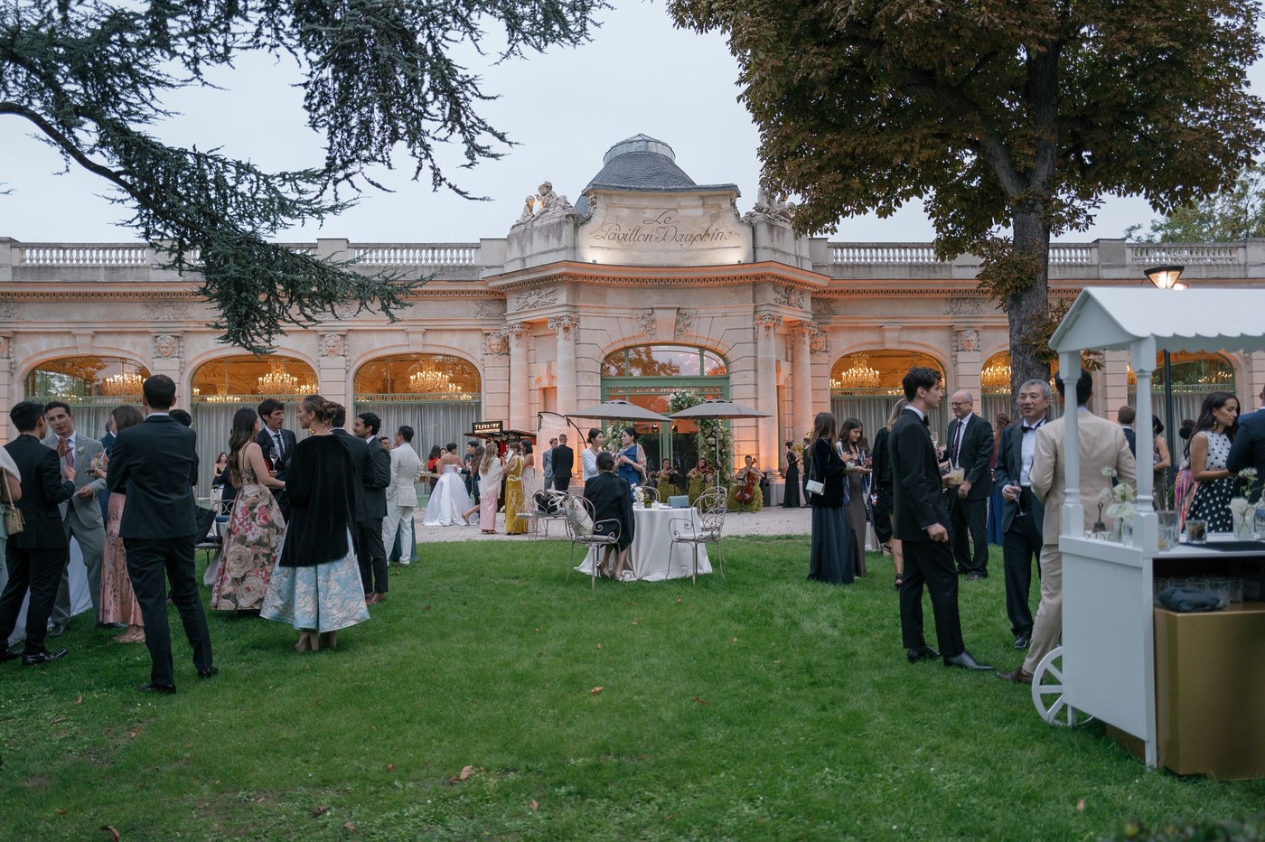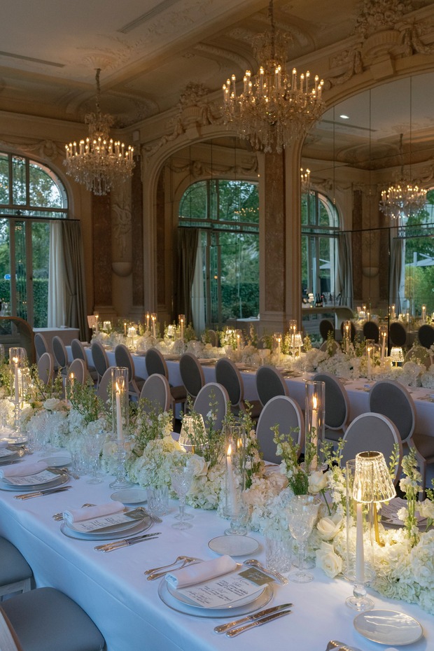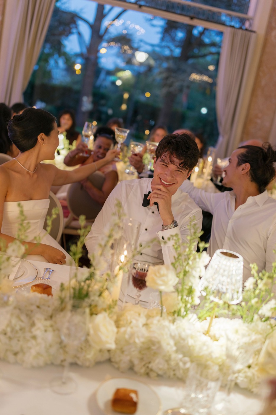 대성당 앞에서 가족사진을 찍은 후, 신혼부부는 리무진을 타고 파비용 도핀의 피로연장으로 향했습니다. 그리고 15분 동안 두 사람만 있으면서 그곳의 모든 걸 만끽하는 시간을 가졌습니다. “피로연장으로 들어가면서 본 디테일 하나하나가 너무나 완벽해서 입이 떡 벌어질 정도였어요. 마리와 루이, 그리고 그 팀이 해낸 거였죠.” 피로연에서도 즐거운 시간이 이어졌습니다. “현악사중주단이 저희를 맞아주었어요. 정말 간절했던 샴페인 한 잔을 마실 수 있었고, 하객들은 미소를 지으며 저희를 반겨주었죠. 가장 ‘중요한’ 순간과 사진 촬영이 모두 끝난 뒤라, 비로소 긴장을 좀 풀고 그 순간을 즐길 수 있을 것 같은 기분이 들었어요.”