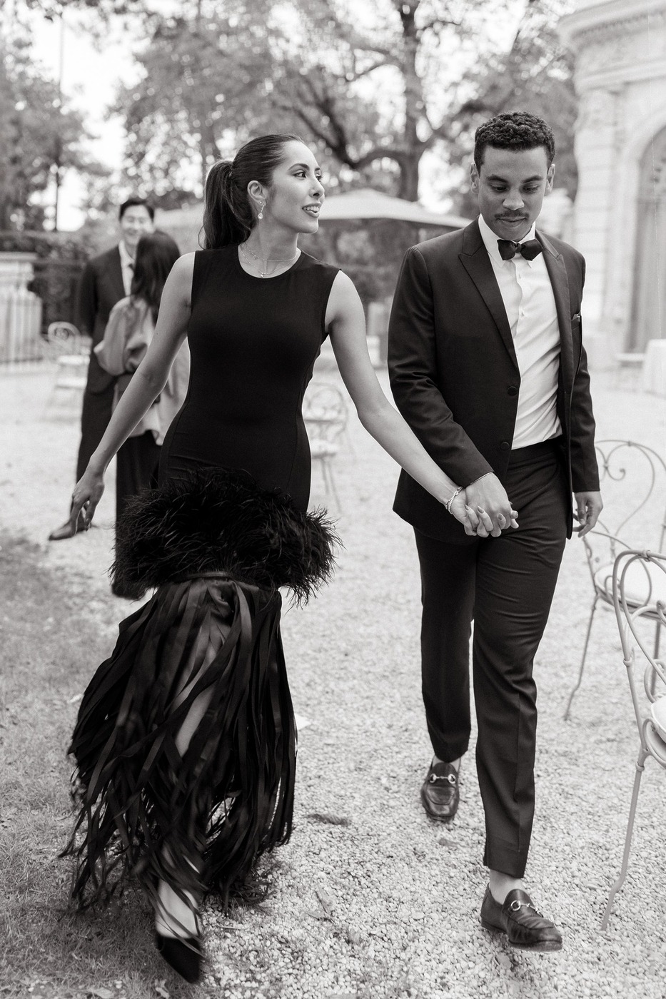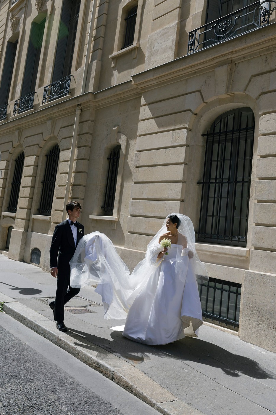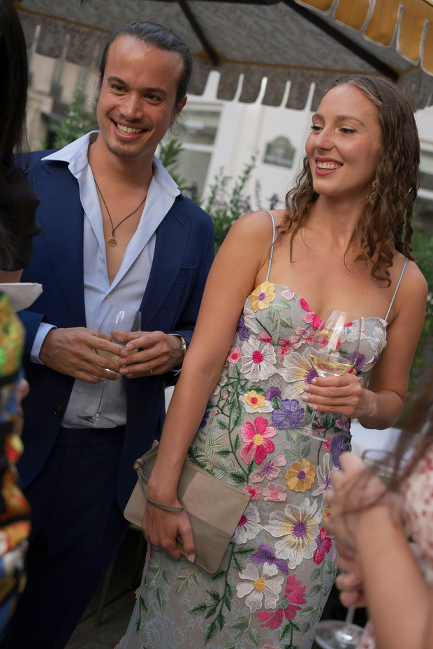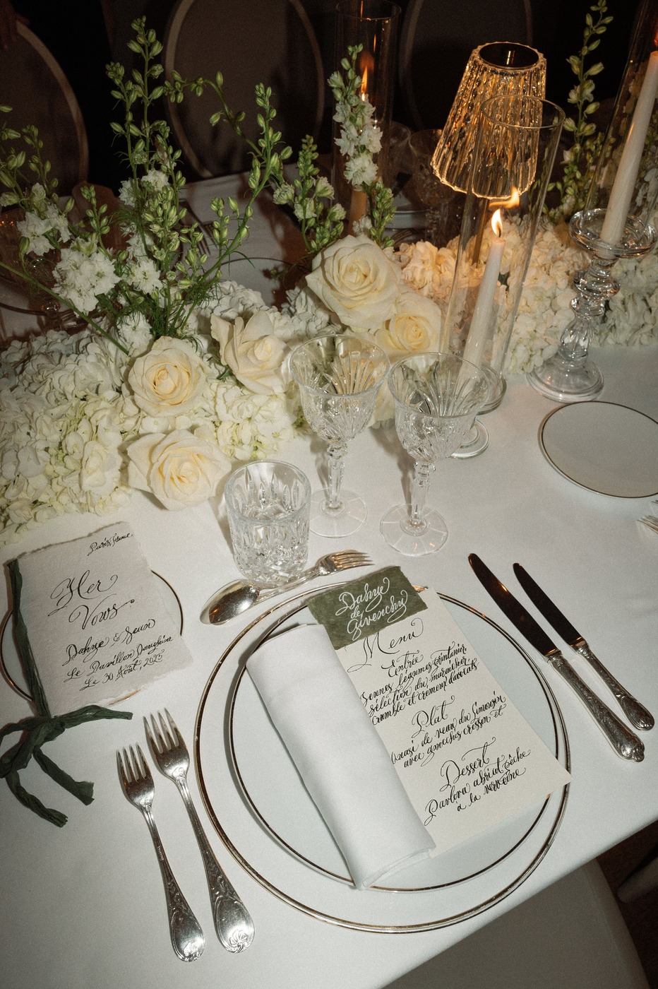 대성당 앞에서 가족사진을 찍은 후, 신혼부부는 리무진을 타고 파비용 도핀의 피로연장으로 향했습니다. 그리고 15분 동안 두 사람만 있으면서 그곳의 모든 걸 만끽하는 시간을 가졌습니다. “피로연장으로 들어가면서 본 디테일 하나하나가 너무나 완벽해서 입이 떡 벌어질 정도였어요. 마리와 루이, 그리고 그 팀이 해낸 거였죠.” 피로연에서도 즐거운 시간이 이어졌습니다. “현악사중주단이 저희를 맞아주었어요. 정말 간절했던 샴페인 한 잔을 마실 수 있었고, 하객들은 미소를 지으며 저희를 반겨주었죠. 가장 ‘중요한’ 순간과 사진 촬영이 모두 끝난 뒤라, 비로소 긴장을 좀 풀고 그 순간을 즐길 수 있을 것 같은 기분이 들었어요.”