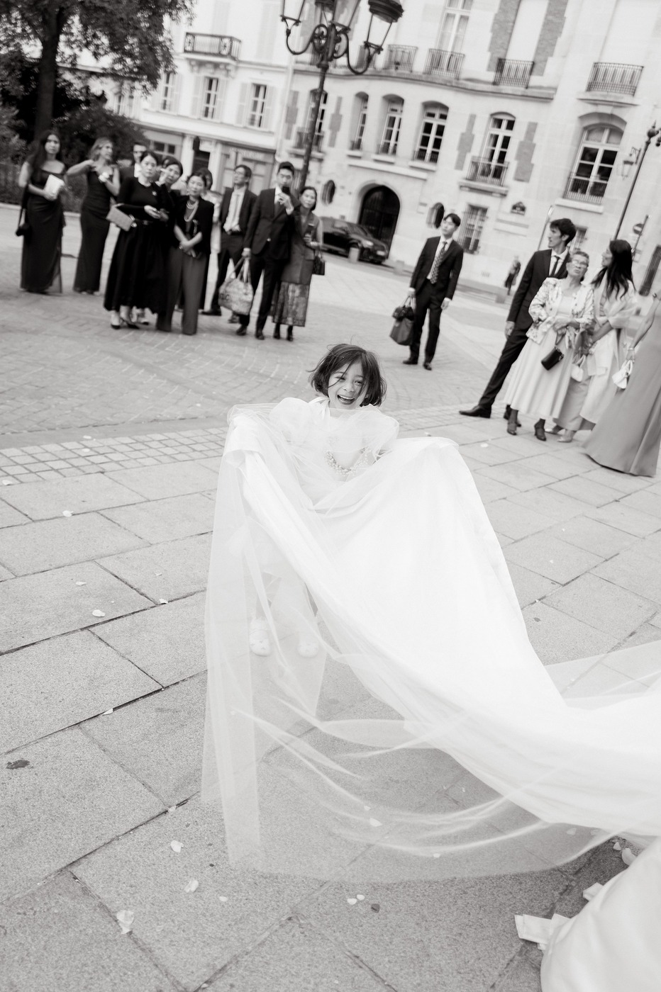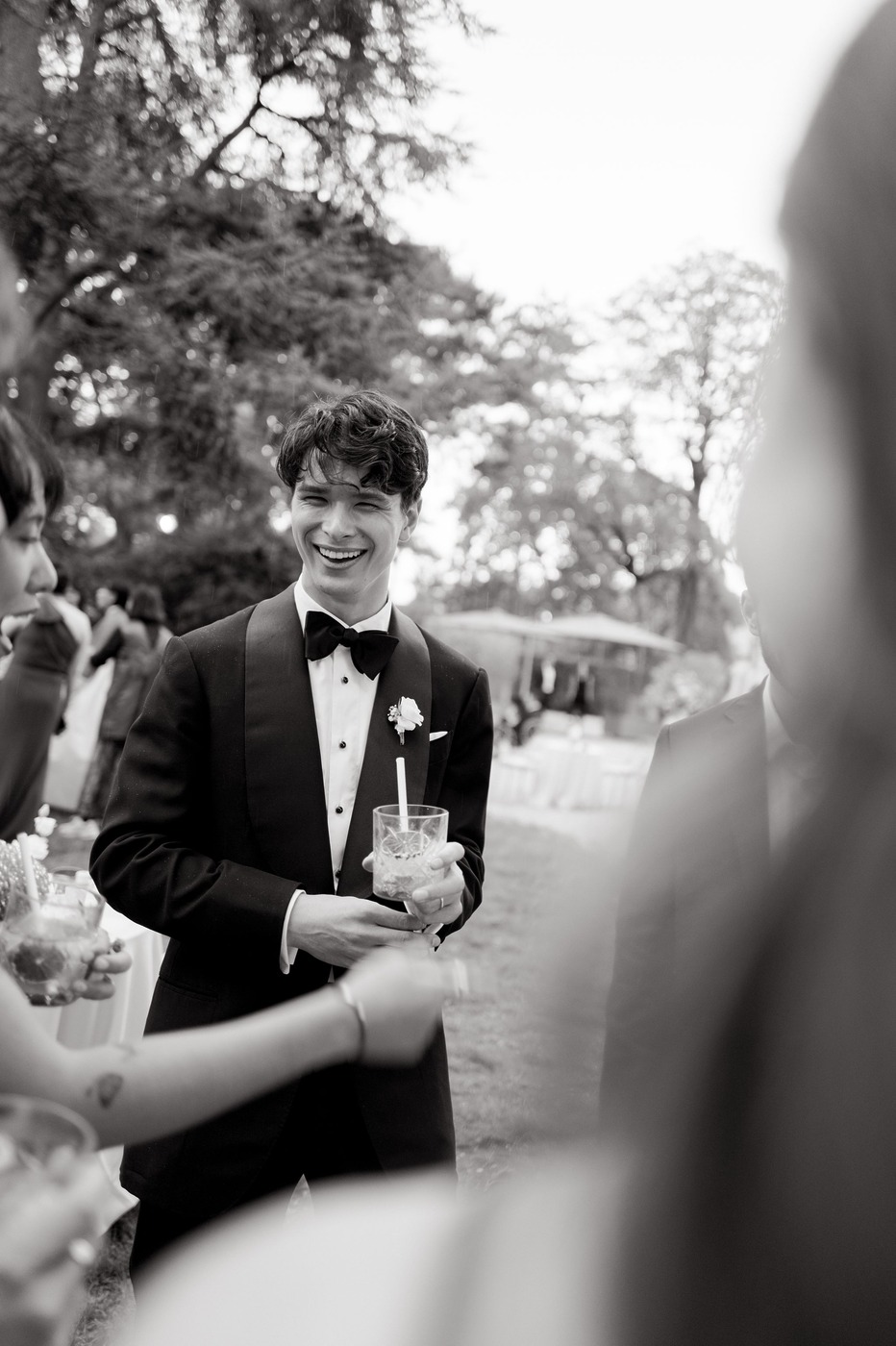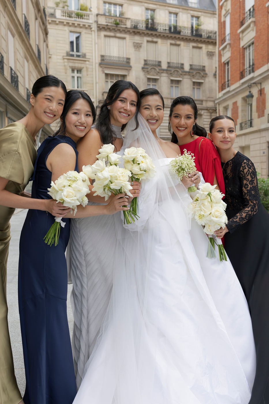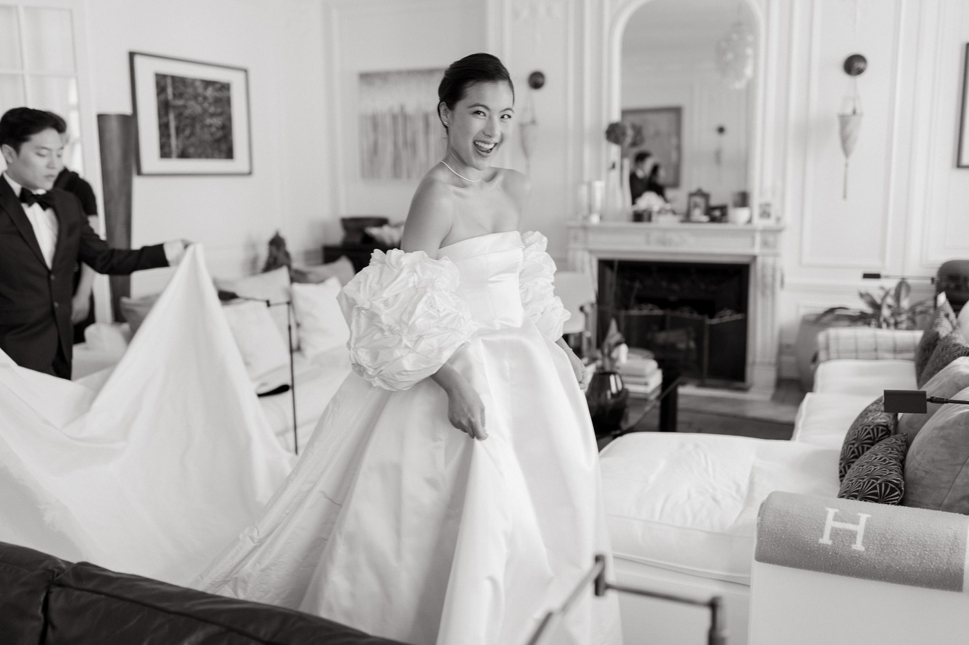 대성당 앞에서 가족사진을 찍은 후, 신혼부부는 리무진을 타고 파비용 도핀의 피로연장으로 향했습니다. 그리고 15분 동안 두 사람만 있으면서 그곳의 모든 걸 만끽하는 시간을 가졌습니다. “피로연장으로 들어가면서 본 디테일 하나하나가 너무나 완벽해서 입이 떡 벌어질 정도였어요. 마리와 루이, 그리고 그 팀이 해낸 거였죠.” 피로연에서도 즐거운 시간이 이어졌습니다. “현악사중주단이 저희를 맞아주었어요. 정말 간절했던 샴페인 한 잔을 마실 수 있었고, 하객들은 미소를 지으며 저희를 반겨주었죠. 가장 ‘중요한’ 순간과 사진 촬영이 모두 끝난 뒤라, 비로소 긴장을 좀 풀고 그 순간을 즐길 수 있을 것 같은 기분이 들었어요.”