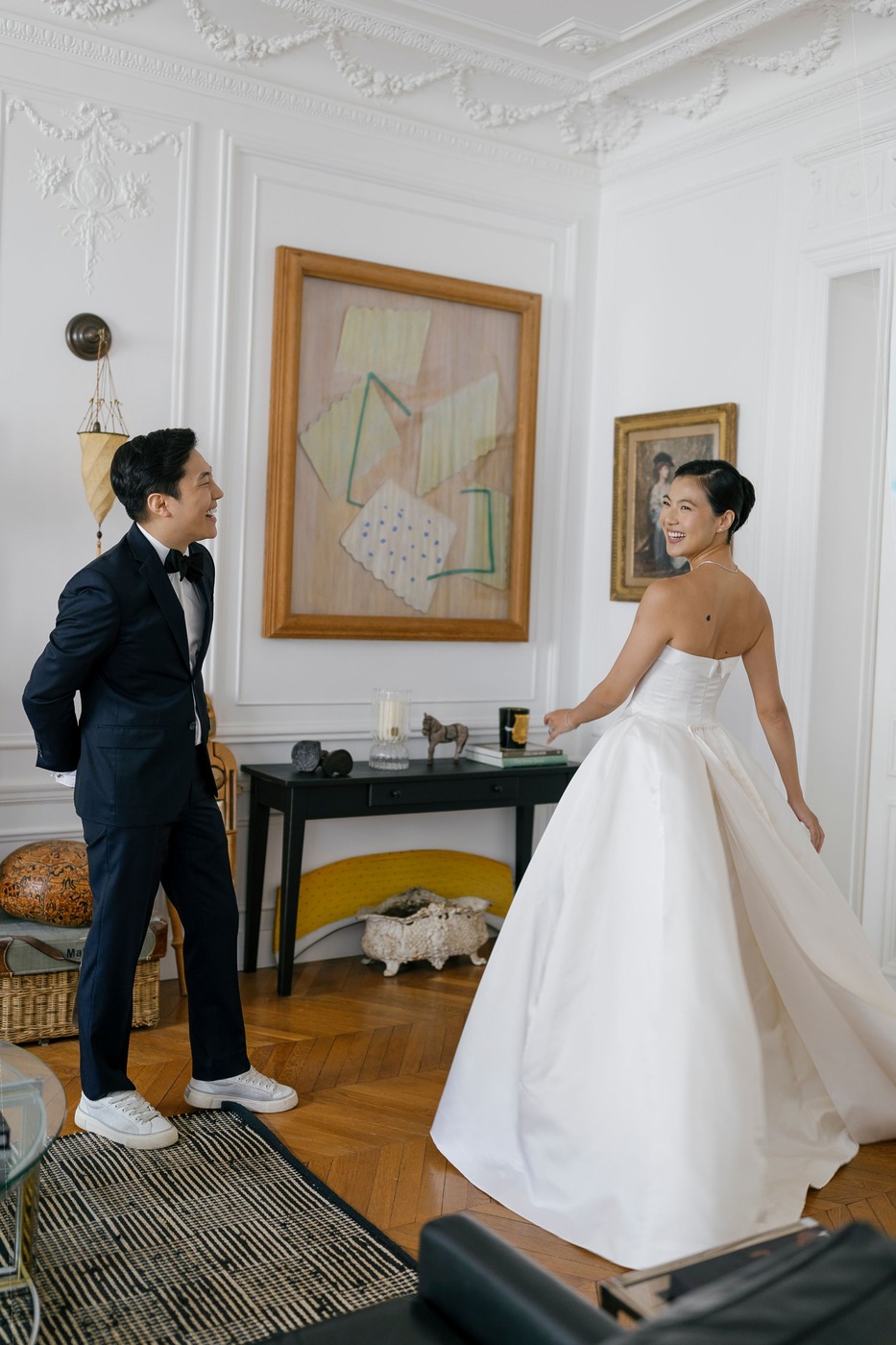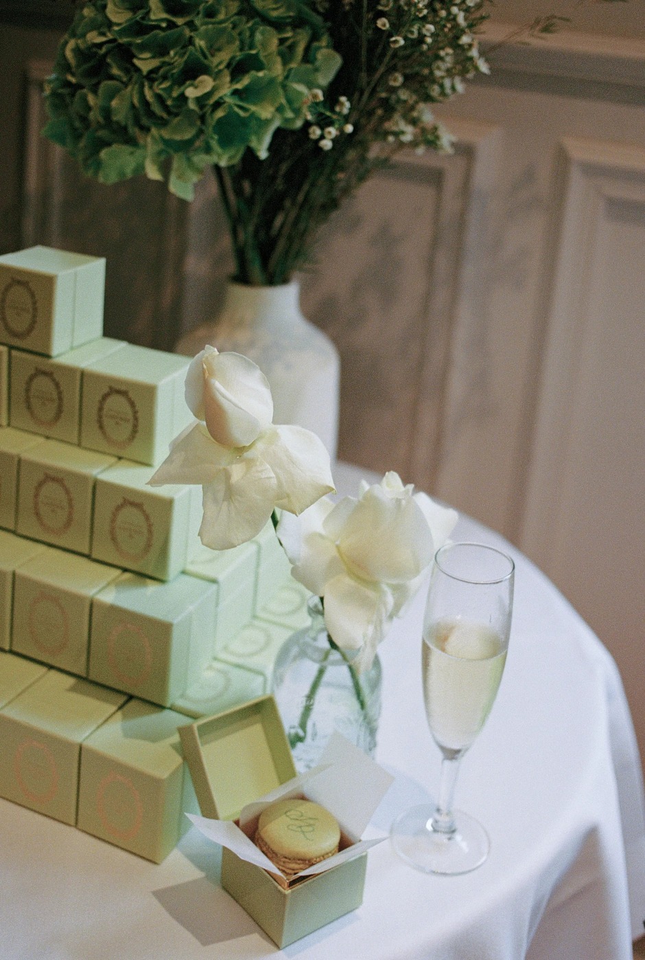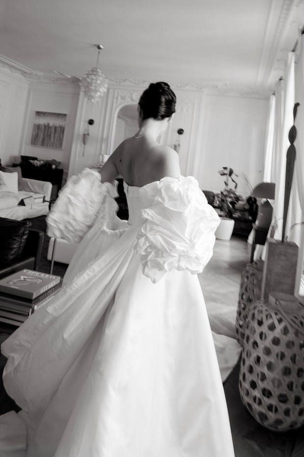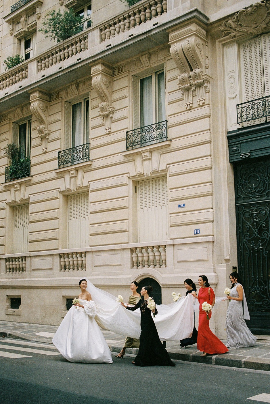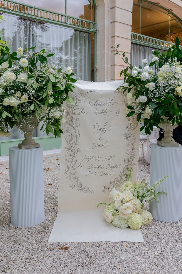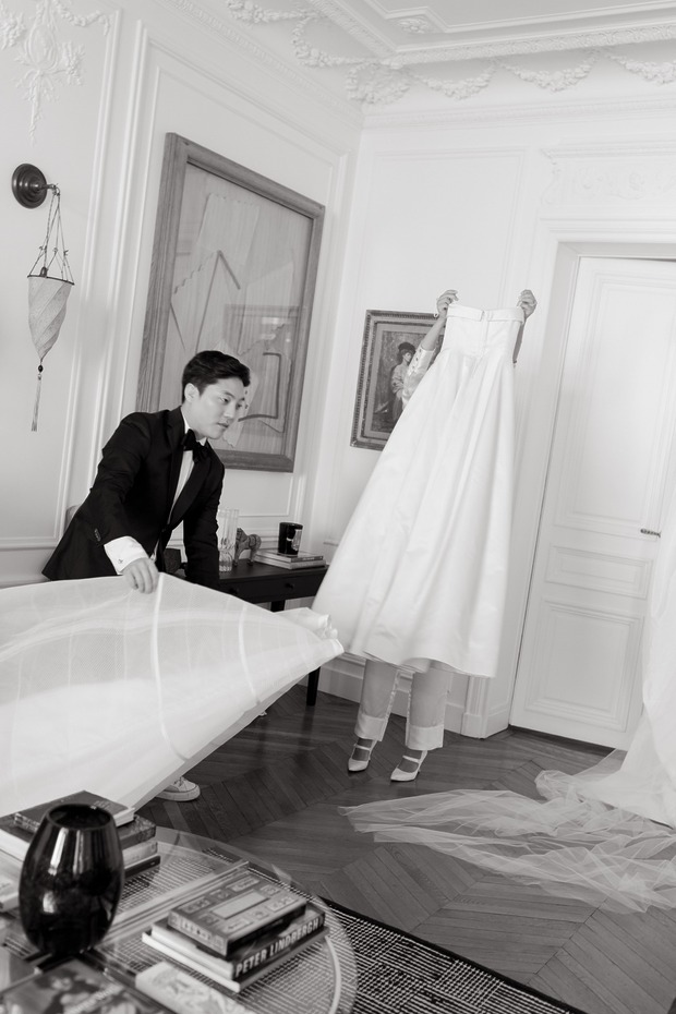 두 사람은 메이든 에이전시(Maiden Agency)의 마리 비통(Marie Bitton)을 웨딩 플래너로 선정하고 가장 먼저 예식장인 르 파비용 도핀(Le Pavillon Dauphine)의 날짜를 확정 지었습니다. 웅장하고 유서 깊은 건축물에, 넓은 야외 공간이 있고, 소음에 대한 민원이 발생하지 않을 만큼 주거지와 충분히 떨어져 있는 등 모든 조건에 부합하는 장소였습니다. 다혜 씨는 “시류를 타지 않고, 클래식하고, 또 분명하게 파리지앵다운 결혼식을 구상했어요”라고 말합니다. “저는 비전 보드 만들기 덕후거든요. 몇 주 동안 주말마다 각 행사의 분위기와 영감을 보여줄 수 있는 이미지를 찾았어요. 그리고 마침내 파워포인트 슬라이드 100페이지가 넘는 분량의 만족스러운 비전 보드를 완성해 마리에게 공유했어요. 마리가 그걸 바탕으로 적합한 업체와 디자이너를 멋지게 찾아주었죠.” 숀이 웃으며 “저는 음식과 와인을 담당했어요”라고 덧붙였습니다.
