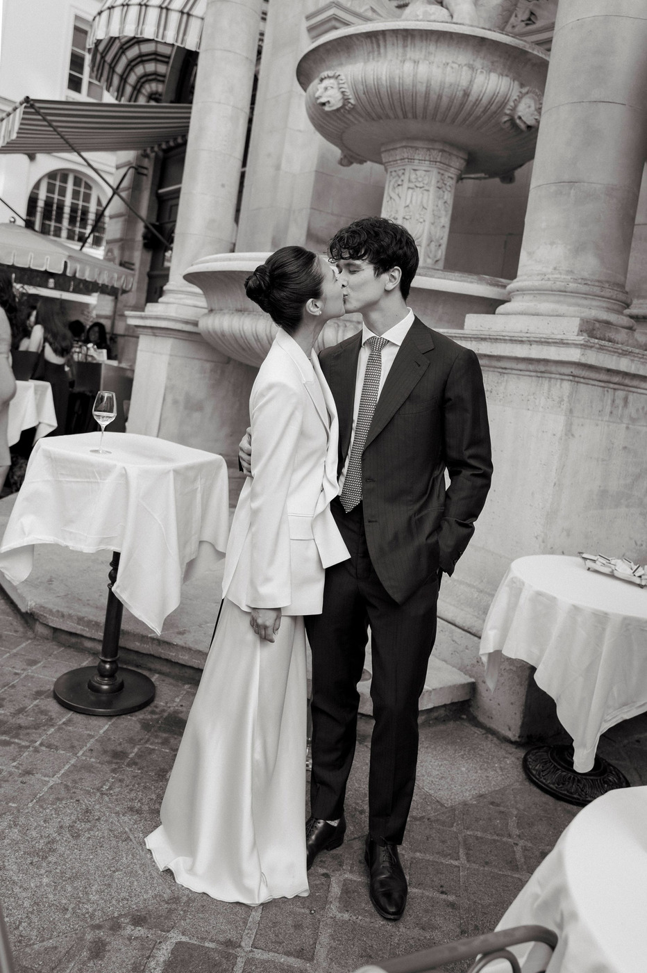 결혼식 전야 만찬은 라 퐁텐 가이용(La Fontaine Gaillon)에서 열렸습니다. “원래는 다른 레스토랑을 골랐어요. 그런데 그곳이 만찬을 몇 주 앞두고 파산해서 이곳으로 바꾸게 된 거예요.” 다혜 씨가 설명합니다. “메이든 에이전시의 마리와 마리의 사업 파트너 루이가 곧바로 새로운 장소를 찾아줬는데, 결과적으로 훨씬 더 만족스러웠어요. 2구의 한구석에 있는 곳이고 말 그대로 영화 세트장 같았어요. 아늑한 테라스가 있어 손님들을 맞으면서 웰컴 드링크를 드리기에도, 손님들이 식사 시간 도중에 담배를 피우거나 바람을 쐬러 드나들기에도 좋았죠.”