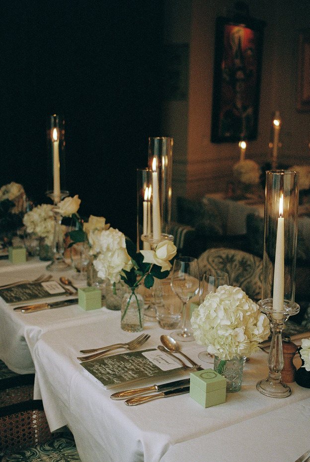 정원에서 환영 칵테일 행사를 가진 후, 하객들은 거울로 장식하고, 촛불을 켜놓은 테이블로 분위기를 낸 연회장으로 안내되었습니다. 만찬은 신부 부모님의 축사로 시작해 신랑 어머니의 축사로 이어졌습니다. 디저트가 나올 때는 숀의 형제들이 가볍지만 의미 있는 축사를 했습니다. “손님들이 가장 좋아한 부분은 다혜의 조카인 지아(Zia)가 관객 큐 카드를 들고 참여한 거였어요”라고 숀은 말합니다.
