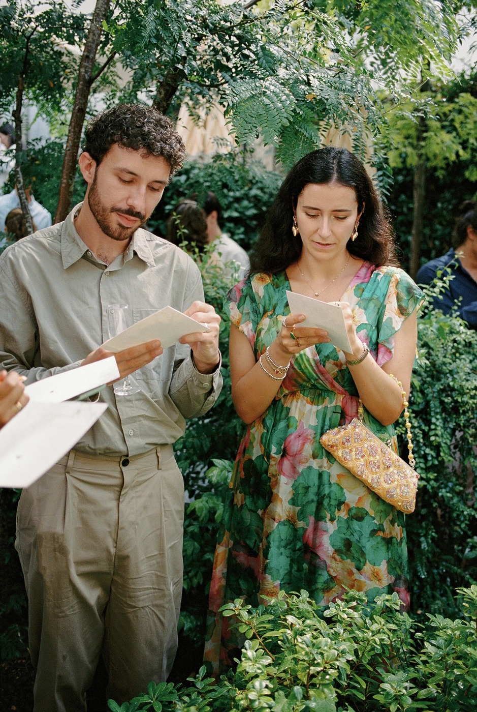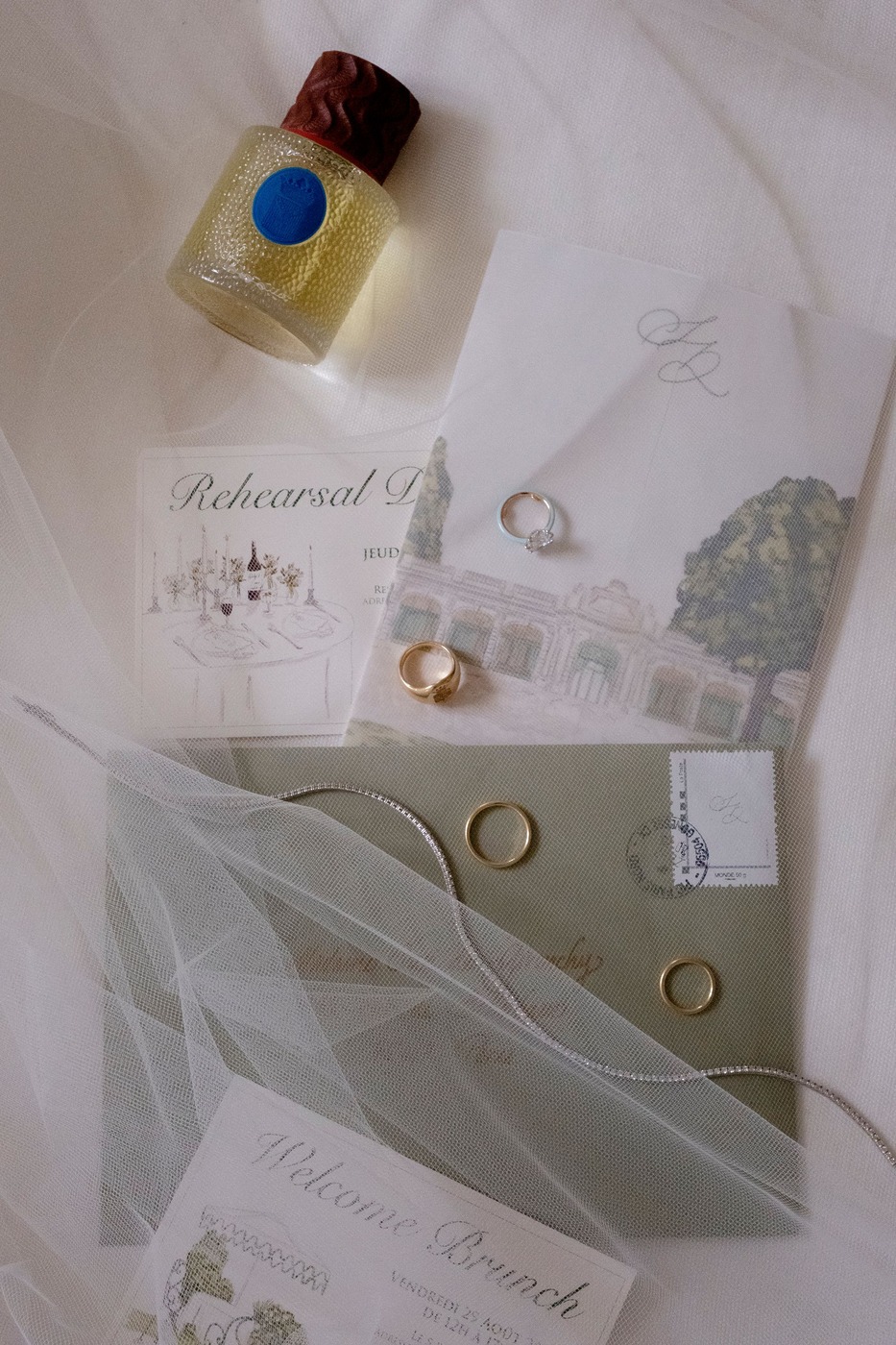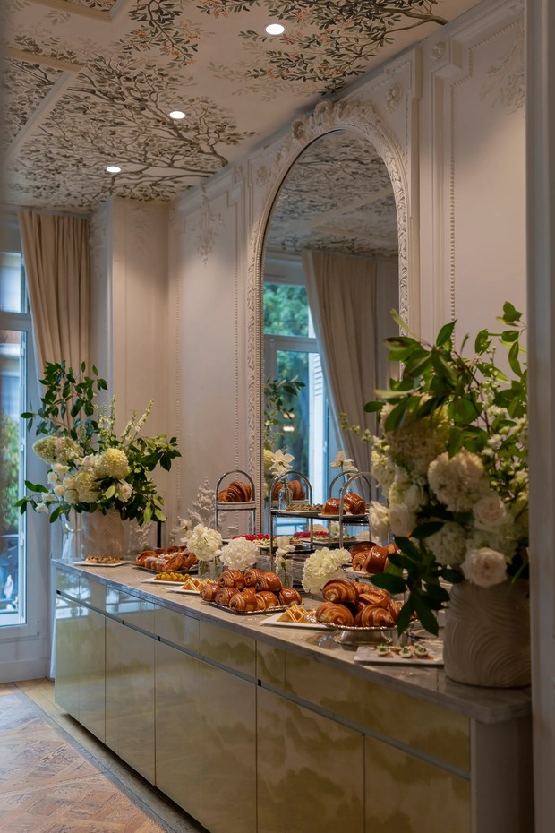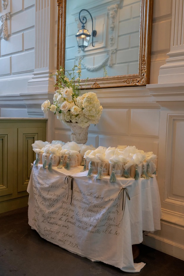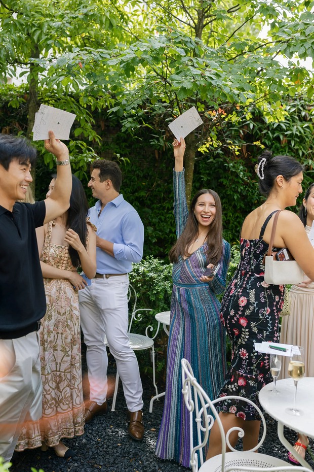 환영 브런치는 다음 날 호텔 르 생 파티퀼리에(Le 5 Particulier)에서 진행되었습니다. “파리 외곽의 매력적인 동네인 뇌이(Neuilly)에 숨어 있는 보석 같은 곳이에요.” 다혜 씨는 설명합니다. “이곳의 초록빛 무성한 프라이빗 정원 덕분에 도심에서 완전히 벗어난 듯한 기분을 느낄 수 있었어요. 그날은 종일 비가 온다는 예보가 있었지만, 다행히도 시작할 시간에 맞춰 하늘이 개었어요. 파리를 테마로 한 상품을 걸고 ‘하객 찾기’ 빙고 게임을 했고, 프로피테롤 카트와 비에누아 빵 뷔페도 준비했죠. 빙고 게임 덕분에 다양한 사람들이 어색함을 깨고 서로 어울릴 수 있었어요!”