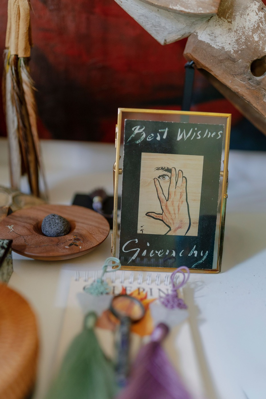 약혼반지와 결혼반지는 모두 숀의 삼촌, 제임스 드 지방시의 커스텀 주얼리 브랜드 태핀(Taffin)의 제품입니다. 태핀의 시그니처 디자인은 컬러가 있는 세라믹 밴드죠. 숀은 약혼반지로 옅은 파란색 밴드에 진주 모양의 다이아몬드를 세팅한 디자인을 선택했습니다. 다혜 씨는 “제 스타일을 그대로 반영한 것 같아요”라고 말합니다. “주변에서 반지가 예쁘다는 말을 항상 들어요. 컬러 밴드가 독특하다고요.”