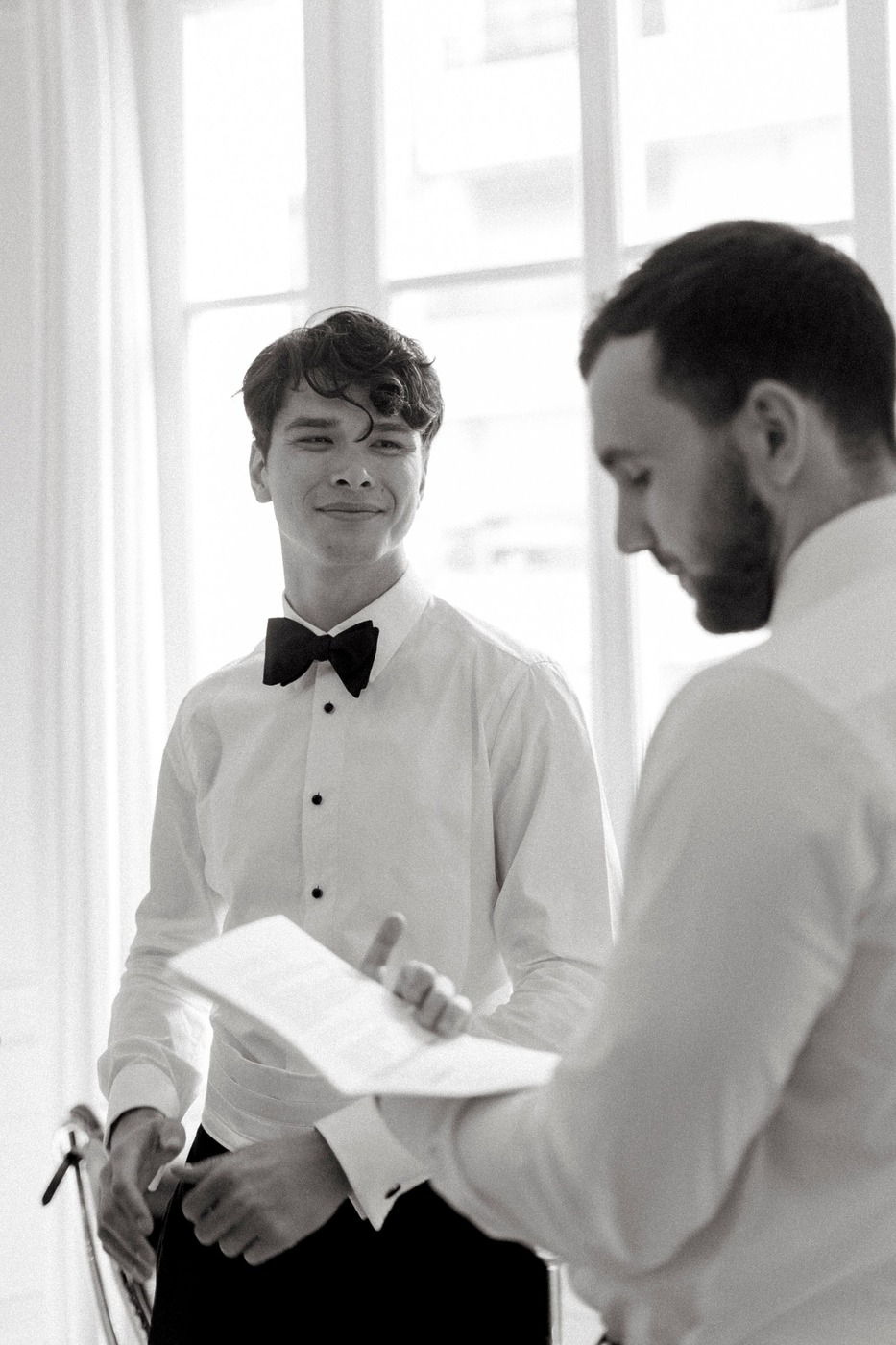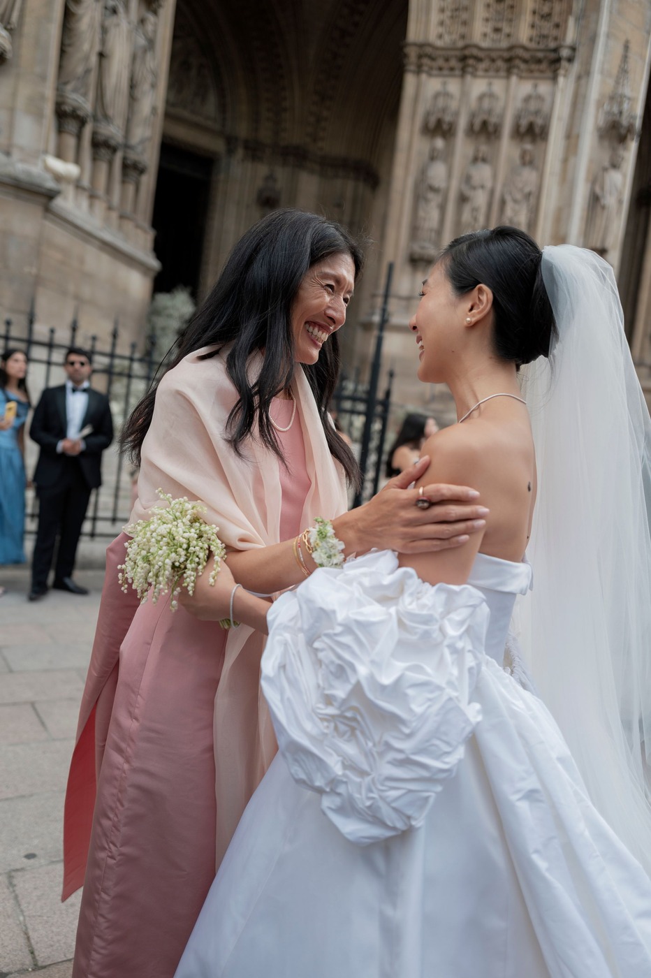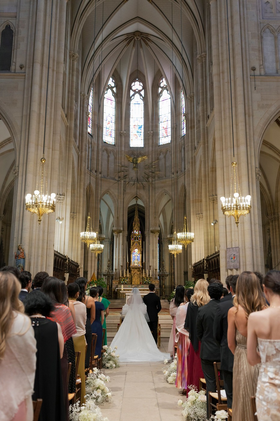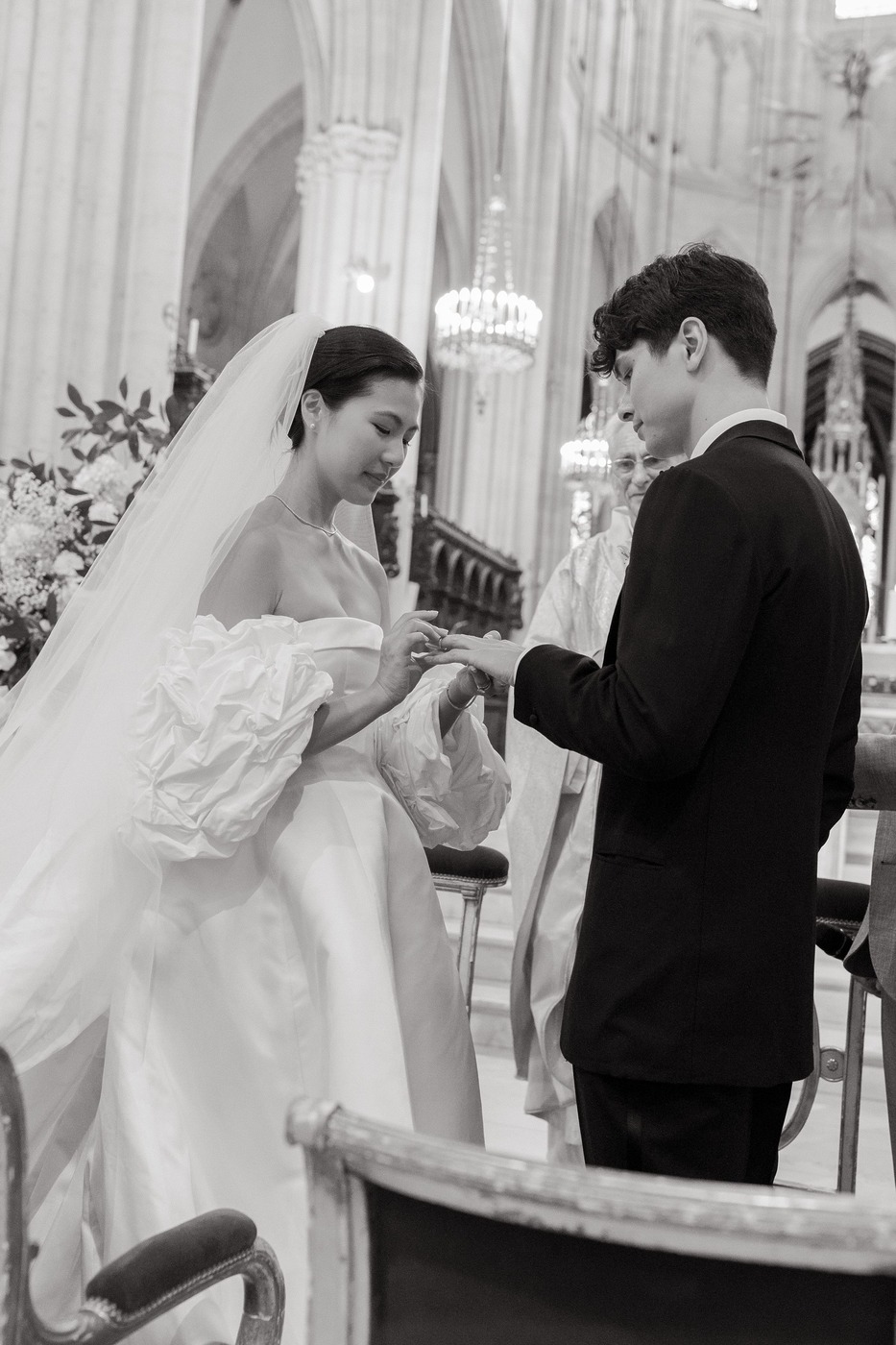결혼식은 토요일 생트 클로틸드 성당(Basilique Sainte-Clotilde)에서 열렸습니다. “둘 다 가톨릭 집안에서 자랐기 때문에 혼인 성사를 올리고 싶었어요.” 숀은 설명합니다. “생트 클로틸드 성당은 저희 가족이 사는 구에 있어요. 전에도 그 성당에서 중요한 행사를 치렀죠.” 이들은 본당 신부인 마르크 랑브레 신부를 만나 주례를 부탁했는데, 공교롭게도 이 결혼식은 랑브레 신부가 은퇴하기 전 집전한 마지막 미사가 되었습니다. 다혜 씨는 “결혼식 주말 동안 제가 가장 좋았던 순간이 이 미사였어요”라고 말합니다. “저희를 사랑하는 모두의 마음을 느낄 수 있었어요. 아버지와 함께 식장에 입장하면서, 지금의 저를 있게 해준 모든 사람들의 얼굴을 볼 때는 감정이 북받쳐 올랐어요.”