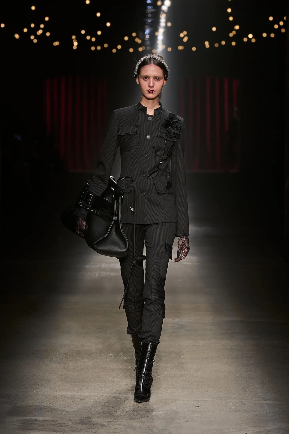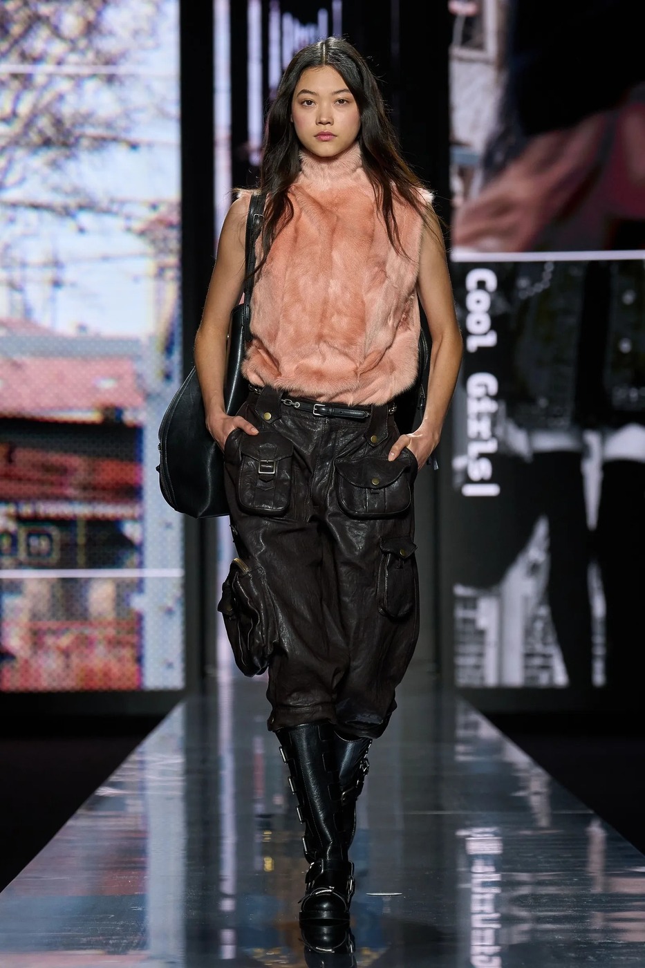 이번 시즌 카고 팬츠 이야기를 하면서 돌체앤가바나를 빼놓을 수 없습니다. 루스한 가죽 카고 팬츠를 선보이며 Y2K 감성을 제대로 표현했거든요. 낡은 느낌의 갈색 가죽 소재와 XL 포켓이 눈에 띄네요. 여기에 핑크 퍼 톱과 은색 버클이 달린 바이커 부츠까지 매치하니 ‘2000년대 팝 디바’ 느낌이 충만합니다. 마치 브리트니 스피어스 전성기의 스타일링 교과서 같은, 도시적이고 팝한 스타일링이네요.