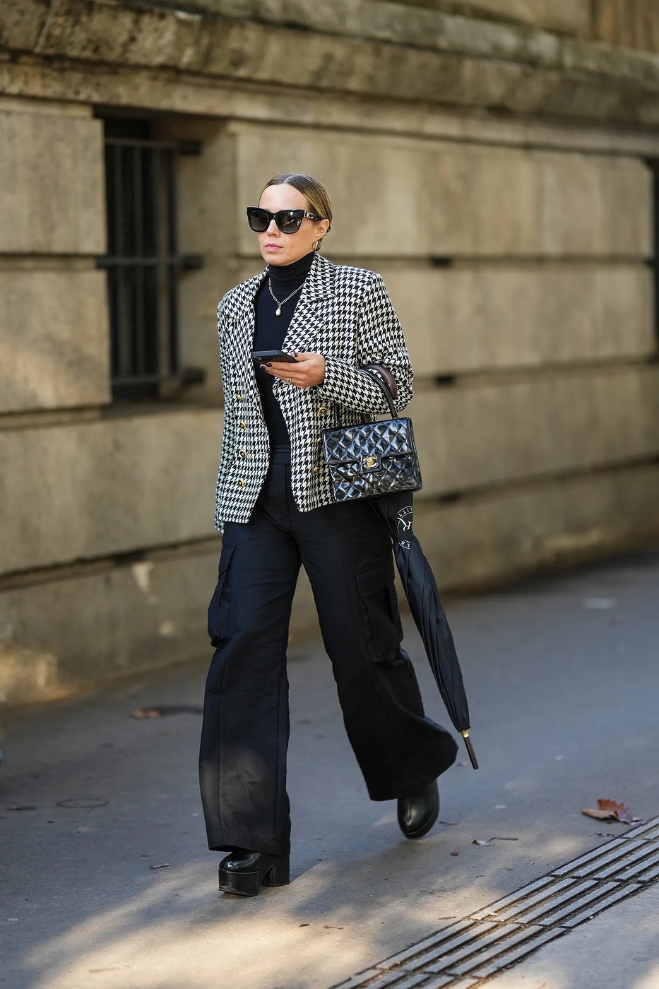카고 팬츠와 플랫폼 부츠의 조합은 가장 ‘2000년대스러운’ 만남이라고 볼 수 있습니다. 대담하고 개성이 넘치는 스타일링이죠. 하지만 다소 부담스러울 수도 있다는 것이 단점입니다. 캐주얼하고 과감한 느낌을 줄이고 싶다면, 미니멀한 터틀넥과 체크 블레이저를 더해보세요. 카고 팬츠 스타일링에 시크함과 우아함을 한 스푼 얹어줄 테니까요. 금요일 출근 룩으로도 손색없을 정도죠.