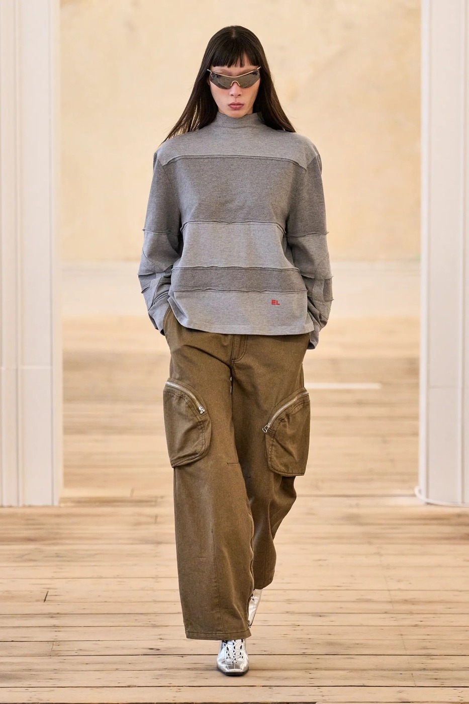 실험적이고 현대적인 패션 DNA를 지닌 브랜드, 에크하우스 라타는 군복 느낌의 카키 컬러 데님 카고 팬츠에 굽이 낮고 앞코가 네모난 메탈릭 부츠를 매치했습니다. 여기에 스트라이프 스웨터를 걸쳐 현대적인 느낌을 주었죠. 그 결과 대학생부터 직장인까지, 누구나 부담 없이 소화할 수 있는 ‘쿨 걸’ 룩이 완성됐습니다.