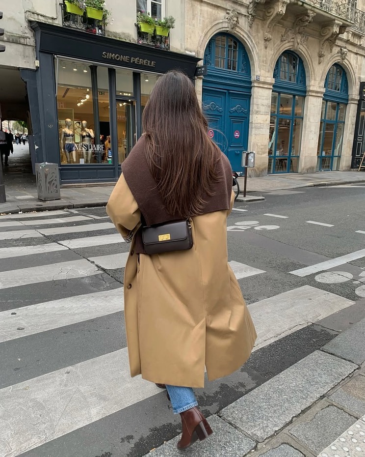 놓치기 쉬운 부분입니다. 브라운이 워낙 가방과 신발에 자주 쓰이는 컬러다 보니 자칫 겹칠 수 있어요. 신발과 가방 색상이 똑같은 브라운일 경우 전체 룩이 ‘완성됐다’기보다 ‘무난하다’ 쪽으로 기울어요. 소재와 컬러를 달리해 세트 같은 느낌을 덜어내고 다채로운 스타일을 연출하세요. 질감이 다른 스웨이드나 가죽, 혹은 다양한 톤의 브라운으로 변주하면 훨씬 세련돼 보입니다. 색이 똑같더라도 질감을 달리하면 스타일링의 깊이가 생기죠.