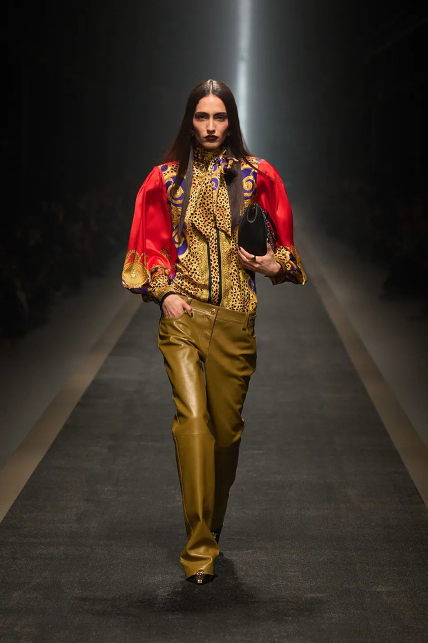 폭이 좁은 바지를 입는 것도 좋습니다. 끌로에는 둥근 어깨 재킷에 슬림 데님을 매치했습니다. 하의의 폭을 단단히 좁혀 균형을 맞췄죠. 베르사체는 반대로 상의가 화려하고 소매 볼륨이 큽니다. 소재도 후들후들하죠. 그래서 팬츠 폭이 좀 더 넉넉해도 자연스럽습니다. 위쪽이 흔들리면 아래쪽은 무게를 실어 안정감을 주는 식입니다.