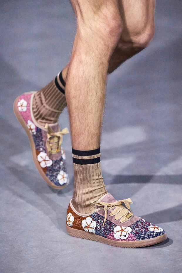 발렌티노는 한술 더 떠, 스니커즈에 비즈를 수놓았습니다. 다양한 색깔의 비즈를 활용하는 것으로도 모자라, 꽃 모양 장식까지 더했죠. ‘운동용 신발’이라는 본분에 전혀 충실하지 않지만, 그 자체로 매력적인 스니커즈였습니다. 멀끔한 수트 팬츠, 혹은 스트레이트 핏 청바지에 발렌티노의 비즈 스니커즈를 매치했다고 상상해보세요. 룩이 심심해 보일 걱정은 아예 내려놓을 수 있을 겁니다.