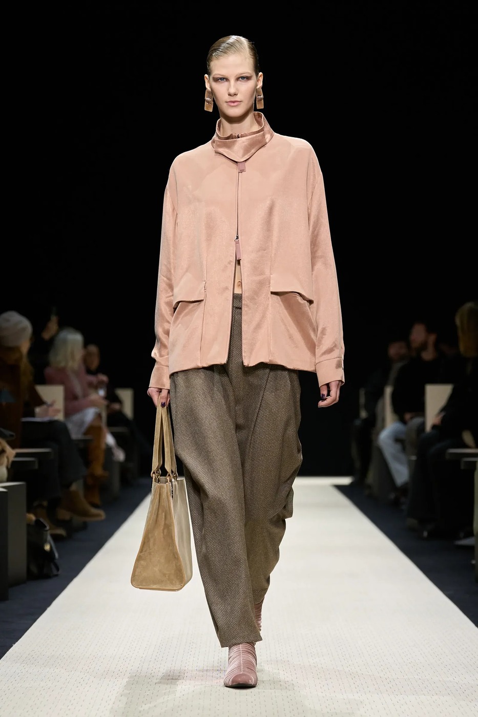 조르지오 아르마니는 부드러운 핑크로 룩의 중심을 잡았습니다. 파스텔 핑크 집업 블라우스에 브라운 울 팬츠를 매치하고, 밑단 사이로 은근히 드러나는 벨벳 앵클 부츠로 질감의 균형을 맞췄죠. 포근하면서도 세련된 조합으로, 출근 룩으로도 손색없습니다.