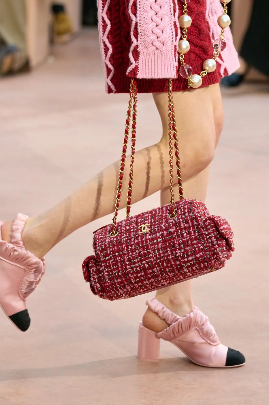 샤넬은 ‘핑크와 레드는 어울리지 않는다’는 고정관념을 깨뜨렸습니다. 핑크와 레드가 섞인 니트 미니 드레스에 블랙 컬러의 둥근 토와 주름 장식이 돋보이는 파스텔 핑크 슈즈를 매치해 로맨틱한 무드를 극대화했죠. 여기에 같은 색 조합의 트위드 백을 더해, 핑크의 화려함과 사랑스러움을 더욱 강조했습니다.