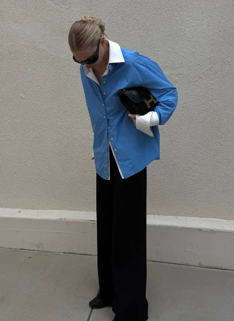 옷장 앞에 서서 두 가지 아이템을 겹쳐 입어보세요. 이때 단 한 가지 규칙은 ‘규칙은 없다’라는 겁니다. 매번 셔츠와 니트 정도만 레이어드했다면, 이번엔 셔츠에 셔츠, 니트에 니트를 겹쳐 입어보는 거죠. 엘사는 화이트 셔츠에 블루 셔츠를 겹쳤습니다. 이미 셔츠 두 장 조합만으로 충분히 포인트가 되죠. 셔츠가 아니어도 됩니다. 점퍼에 점퍼, 후드에 스웨트셔츠처럼 같은 종류끼리 더해보세요.