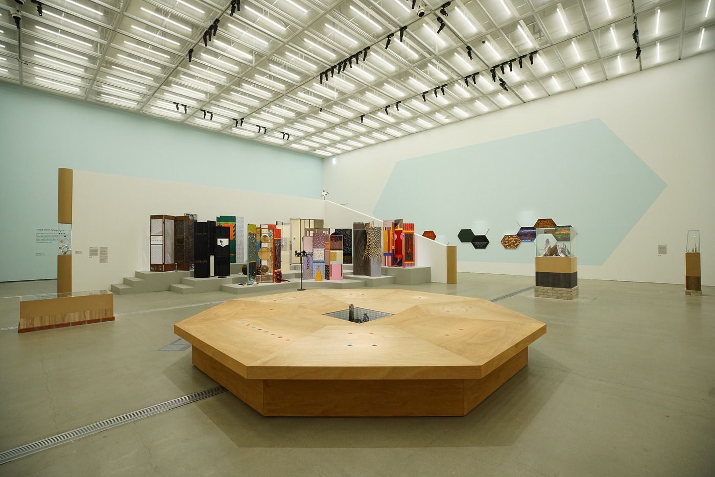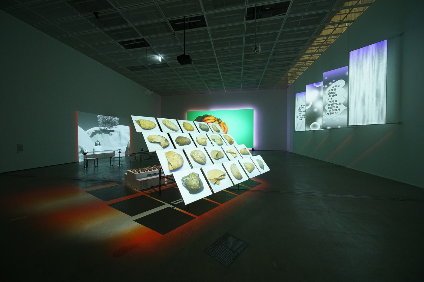 김지평의 새로 쓰는 전통은 바로 옆 전시장에서 펼쳐지는 언메이크랩의 더없이 낯선 풍경과 대구를 이룹니다. 최빛나와 송수연이 구성한 컬렉티브인 언메이크랩은 한국의 역사와 인공지능의 기술을 교차하며 사변적인 세계를 그려내는데요. 특히 이들의 전략 중 하나인 ‘데이터셋-팅’은 단순히 데이터셋을 정보의 집합으로 보지 않고, 데이터가 어떻게 구성되는지 되묻고 그 간극의 균열을 작업에 적극 반영하는 겁니다. 그 결과 데이터는 사실 기반의 충실한 통계자료가 아니라 엉뚱하게 뒤틀린 결과물로 드러나는데요. 그것은 유머러스하면서도 아이러니하고, 심지어 섬뜩하기까지 합니다. 이들은 인간을 비추는 기계의 눈을 통해, 기술이 예술을 감각하게 할 뿐만 아니라 예술이 기술을 다시금 감각하게 하는 방식이 될 수 있음을 보여줍니다.