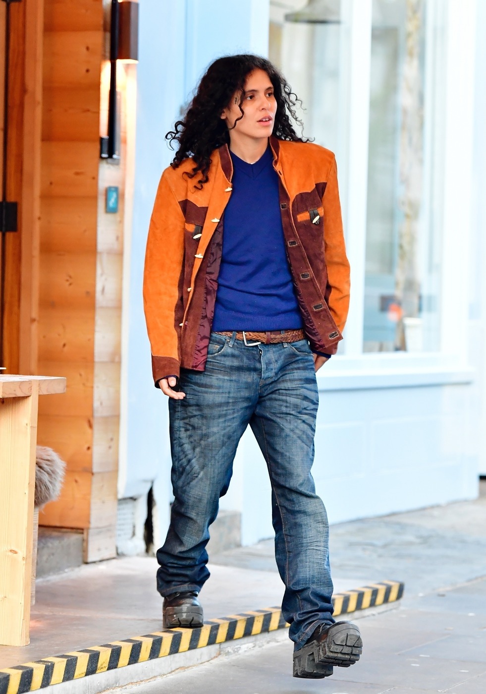 반면 070 셰이크는 갈색 가죽 재킷과 진청 데님을 선택했습니다. 릴리 로즈 뎁이 클래식한 검정 재킷과 연청 데님을 매치한 것과 달리 가을 내음이 짙게 풍기는 스타일링이었습니다. 룩이 지나치게 칙칙해 보이는 것을 방지하기 위해, 쨍한 코발트 블루 니트 톱을 이너로 착용한 센스도 흥미로웠고요. 빈티지 숍에서 건져 올린 듯한 토글 버튼(흔히 더플 코트에 쓰이는 일명 ‘떡볶이 단추’)을 부착한 재킷 디자인은 그 자체로 포인트가 되기에 충분했습니다. ‘하늘 아래 같은 가죽 재킷에 청바지 조합은 없다’고 말하는 것 같았죠.
