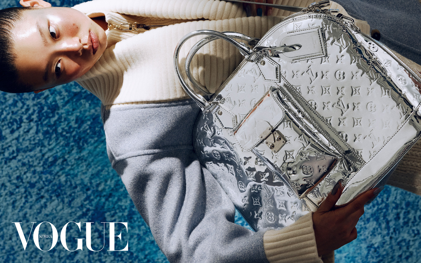 Shine Bright 니트 소재로 라펠을 대신한 재킷과 반짝이는 은빛 가방.